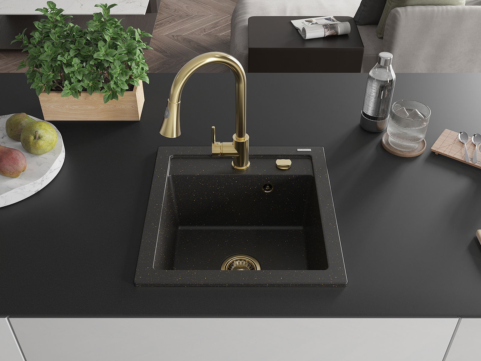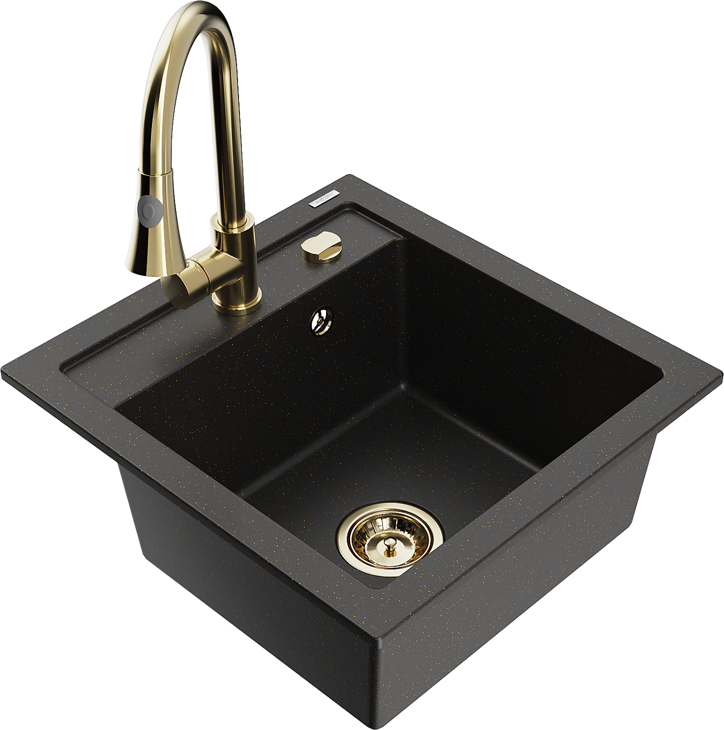 Mexen Vito granitový dřez 1-komorový s kuchyňskou baterií Elia, černý/zlatý metalik - 6503-75-670101-50