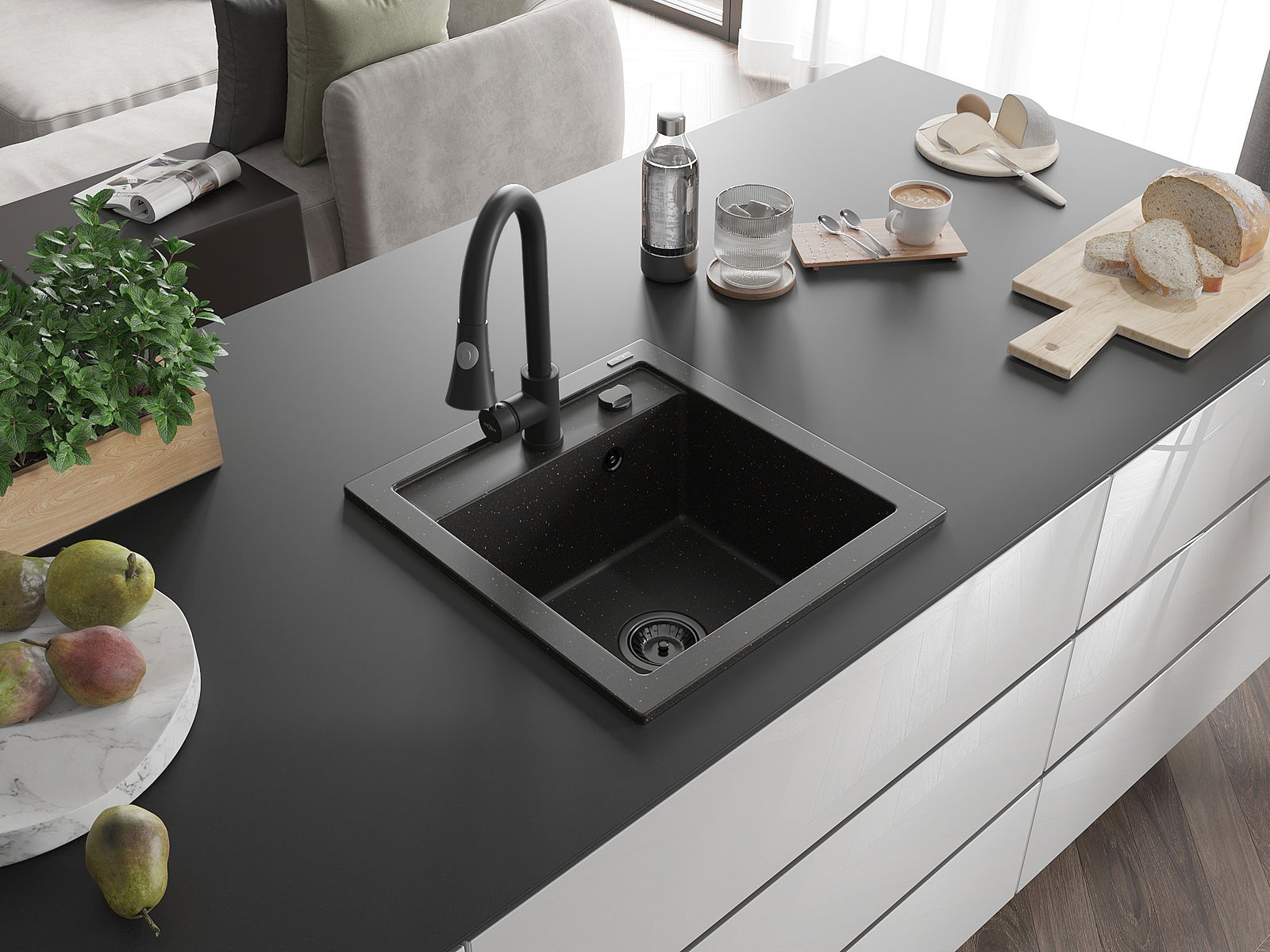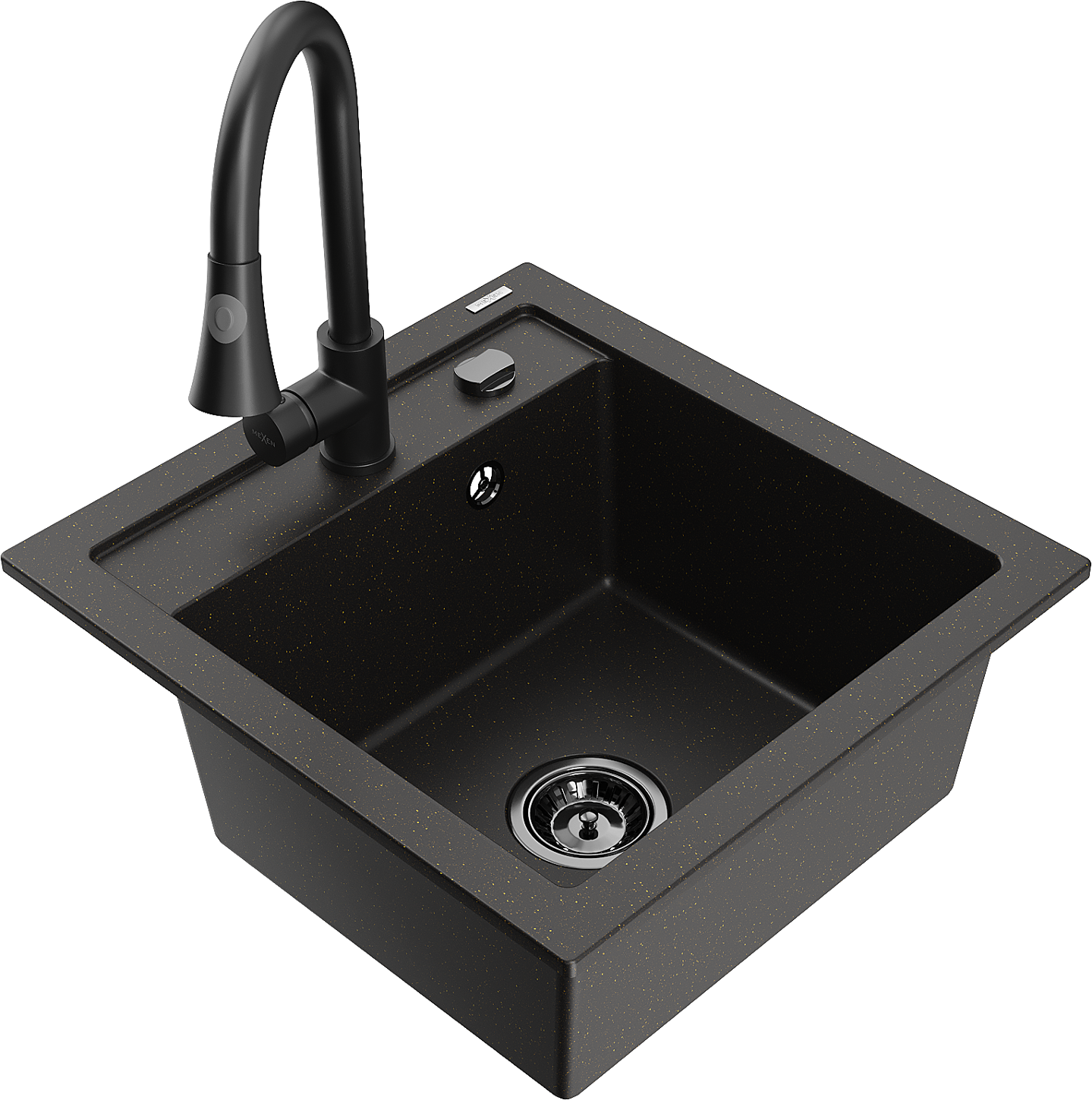 Mexen Vito dřez granitový 1-komorový s kuchyňskou baterií Elia, černý/zlatý metalik - 6503-75-670101-70-B