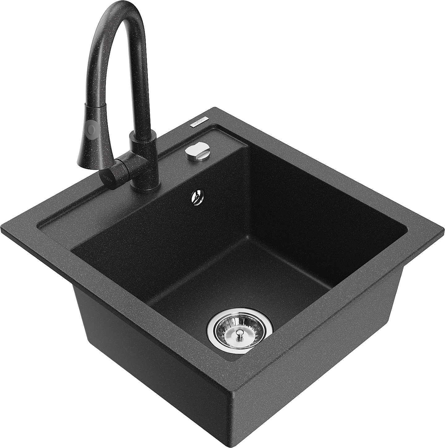 Mexen Vito granitový dřez 1-komorový s kuchyňskou baterií Elia, černý kropenatý - 6503-76-670101-76
