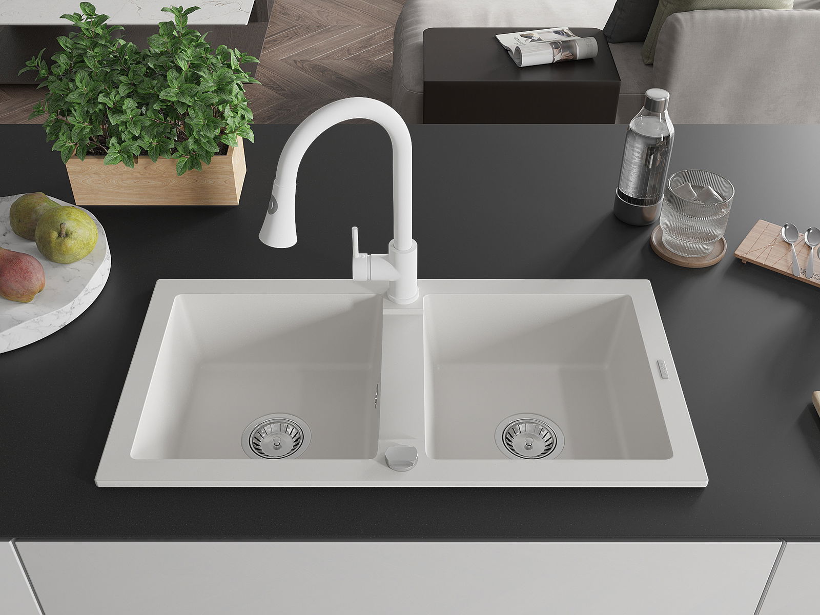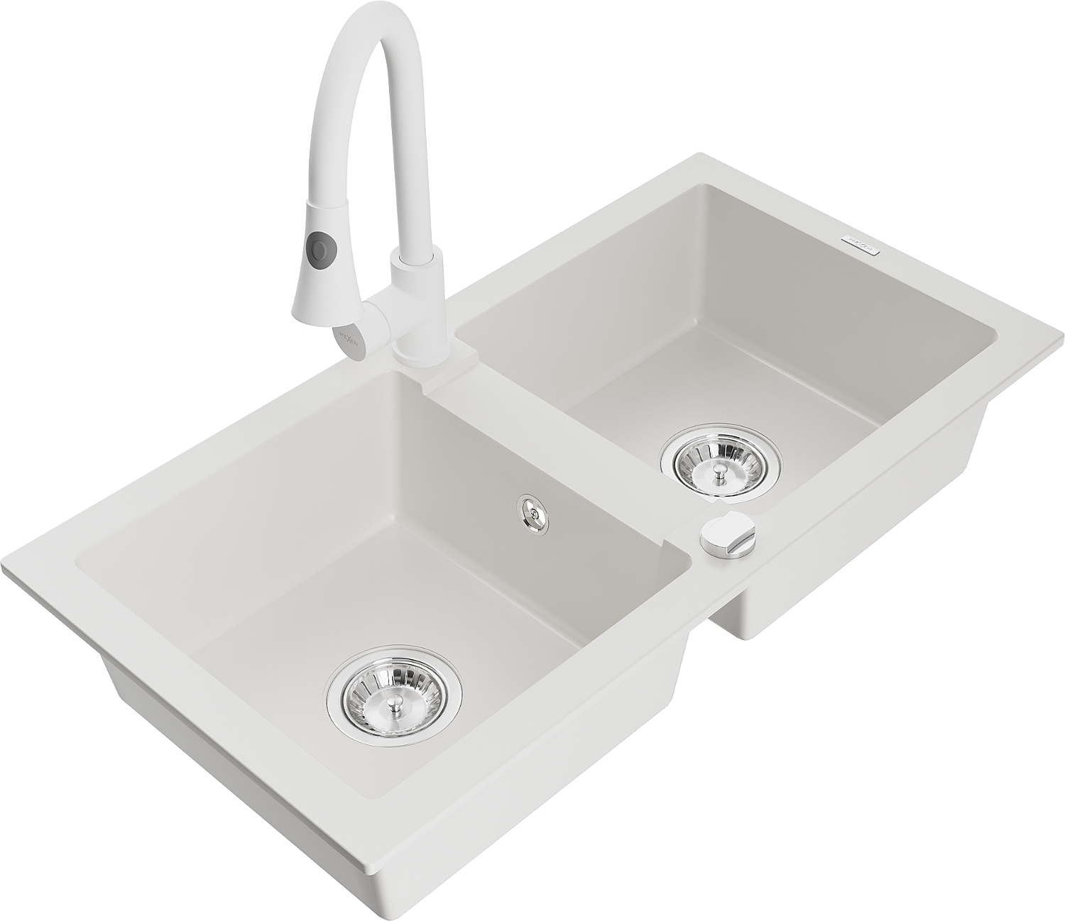 Mexen Mario granitový dřez 2-komorový s kuchyňskou baterií Elia, bílý - 6504-20-670101-20