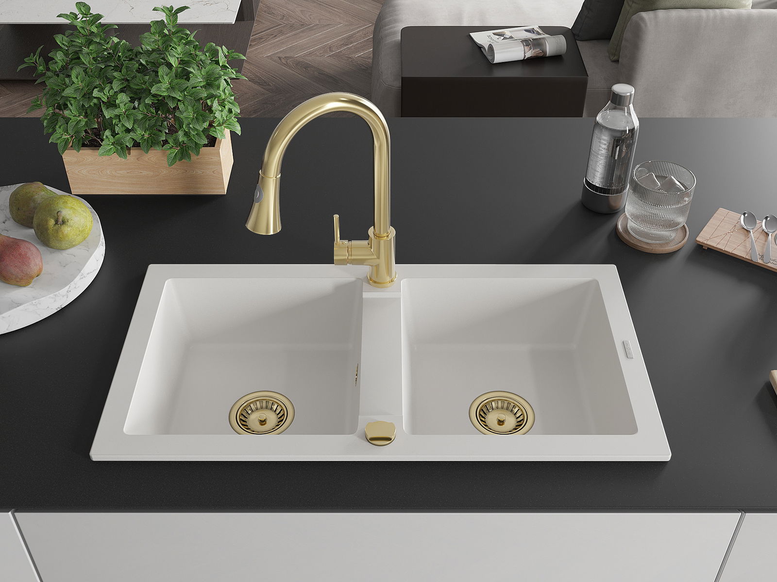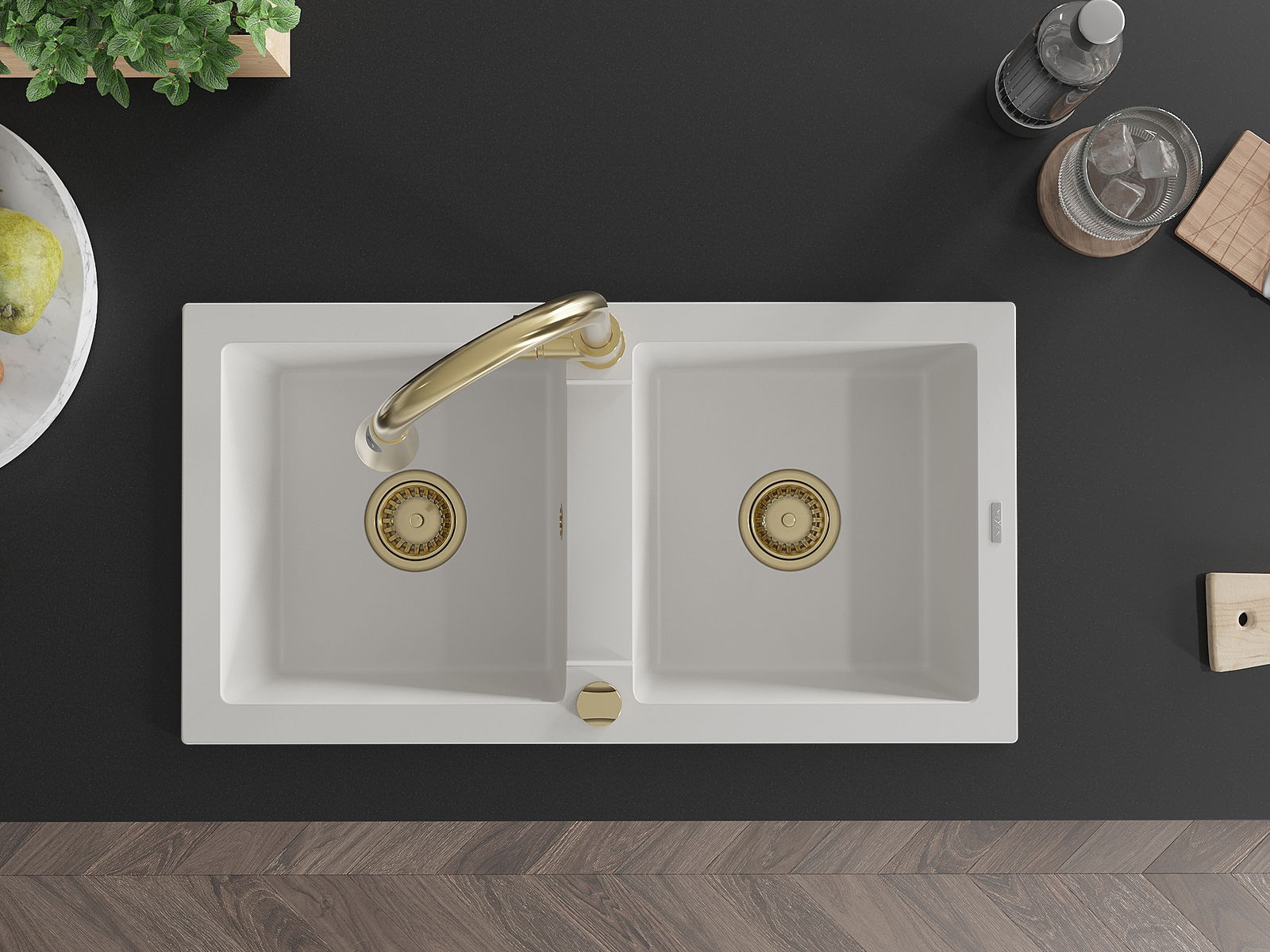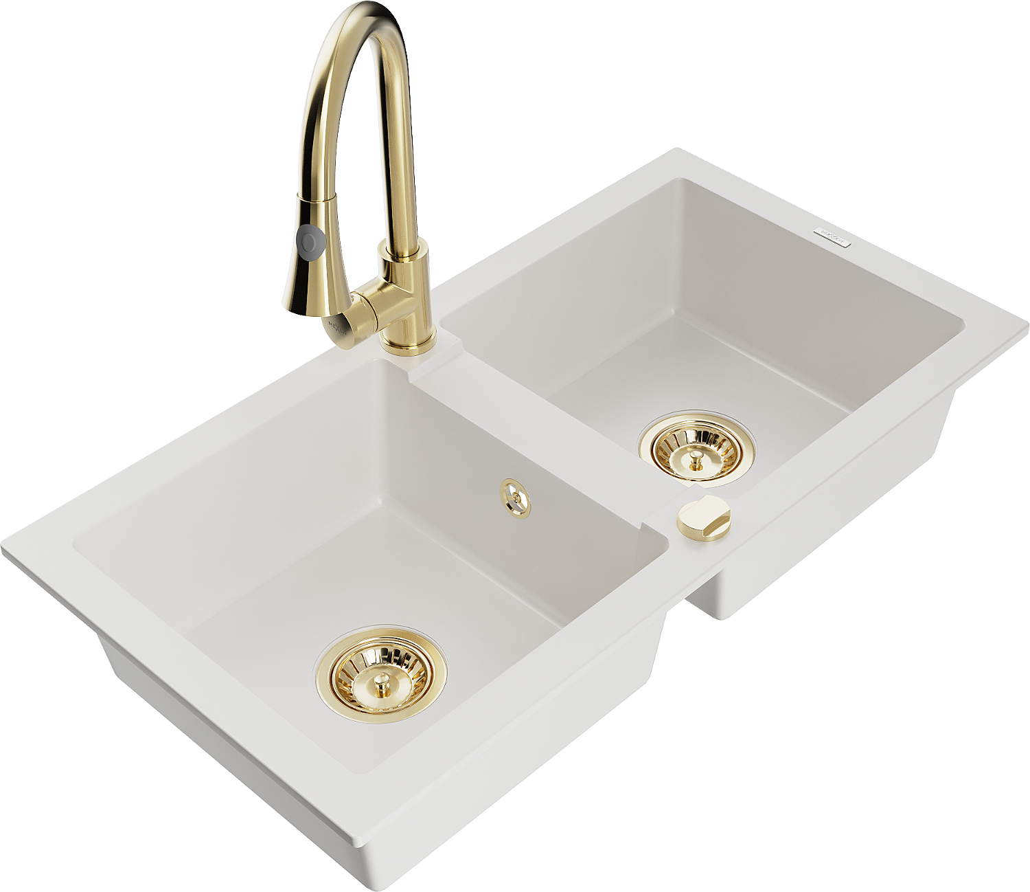 Mexen Mario granitový dřez 2-komorový s kuchyňskou baterií Elia, bílý - 6504-20-670101-50