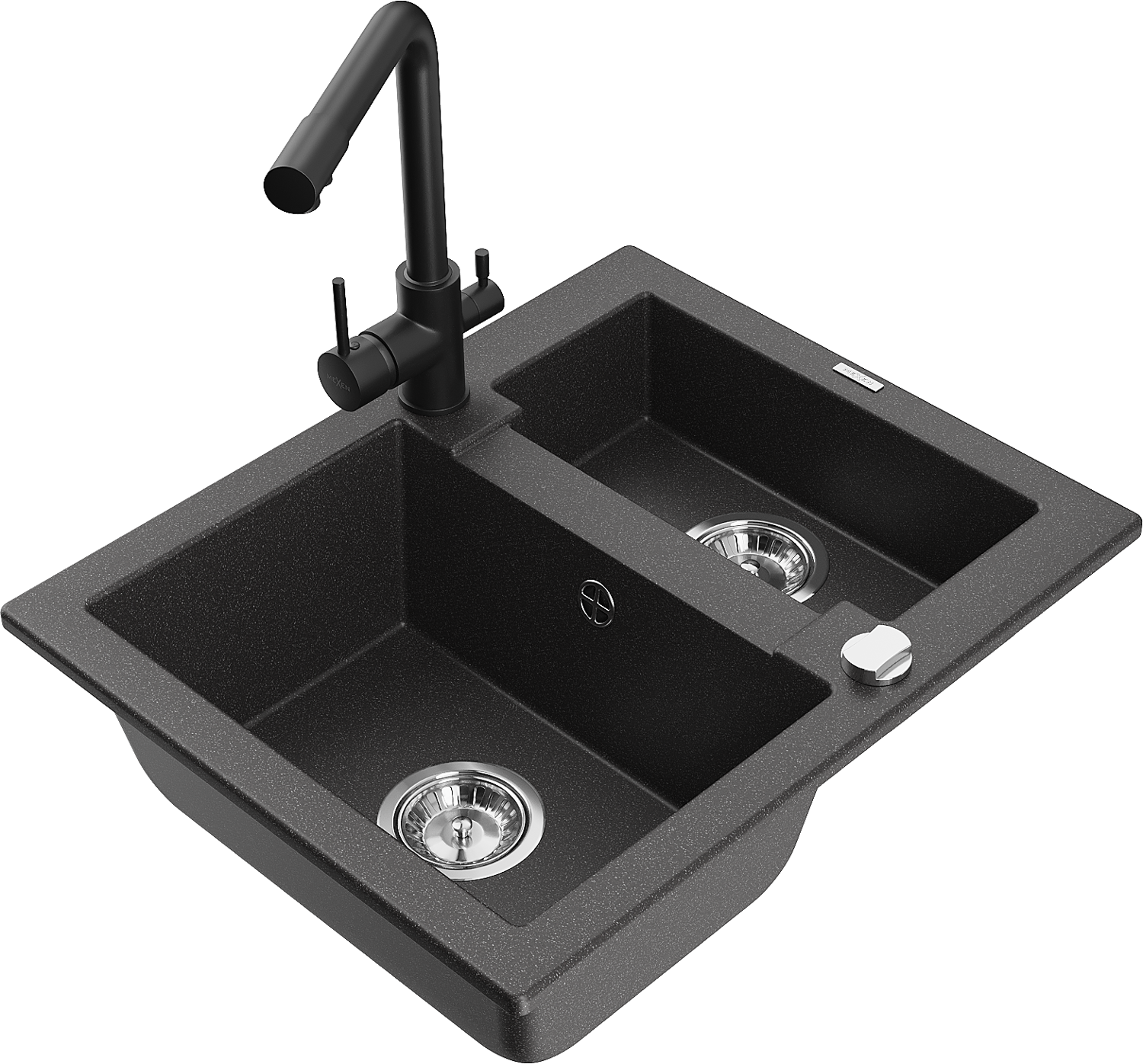 Mexen Carlos granitový dřez 1,5-komorový s kuchyňskou baterií Duero, černý s tečkováním - 6518-76-671600-70