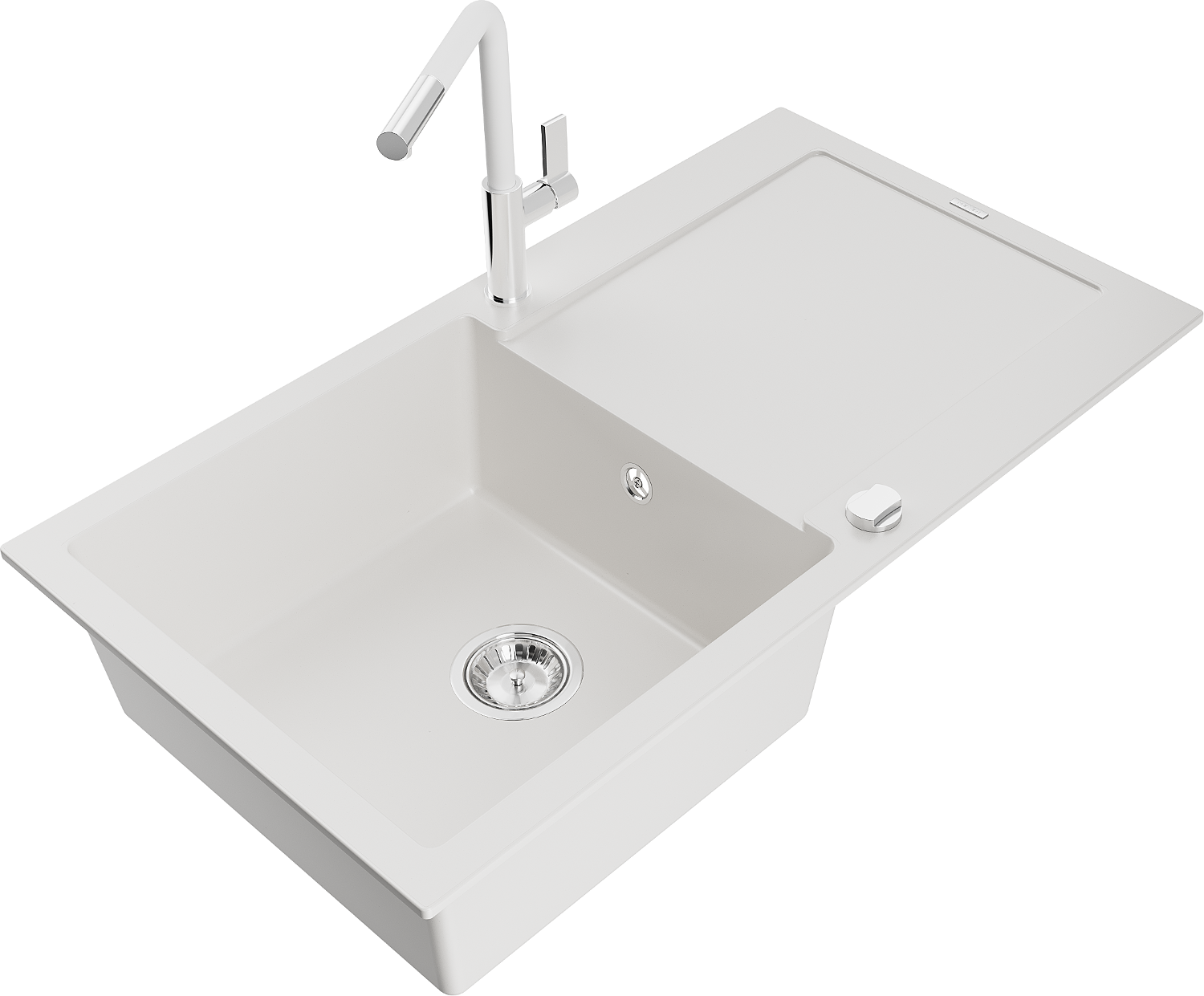 Mexen Leo granitový dřez 1-komorový s odkapávačem a kuchyňskou baterií Flora, bílý - 6501-20-670401-02