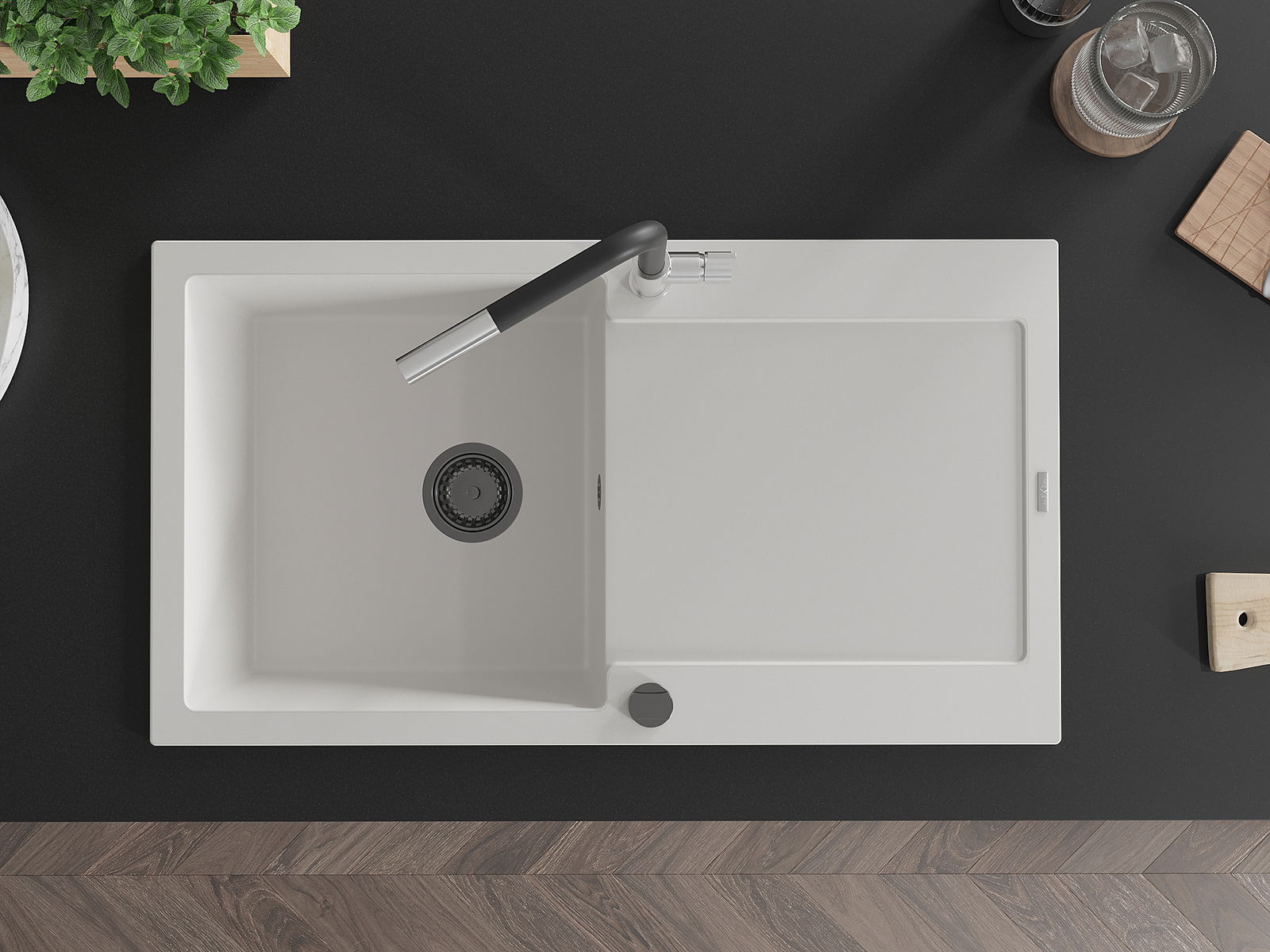 Mexen Leo granitový dřez s 1 komorou a odkapávačem a kuchyňskou baterií Flora, bílý - 6501-20-670401-07-B