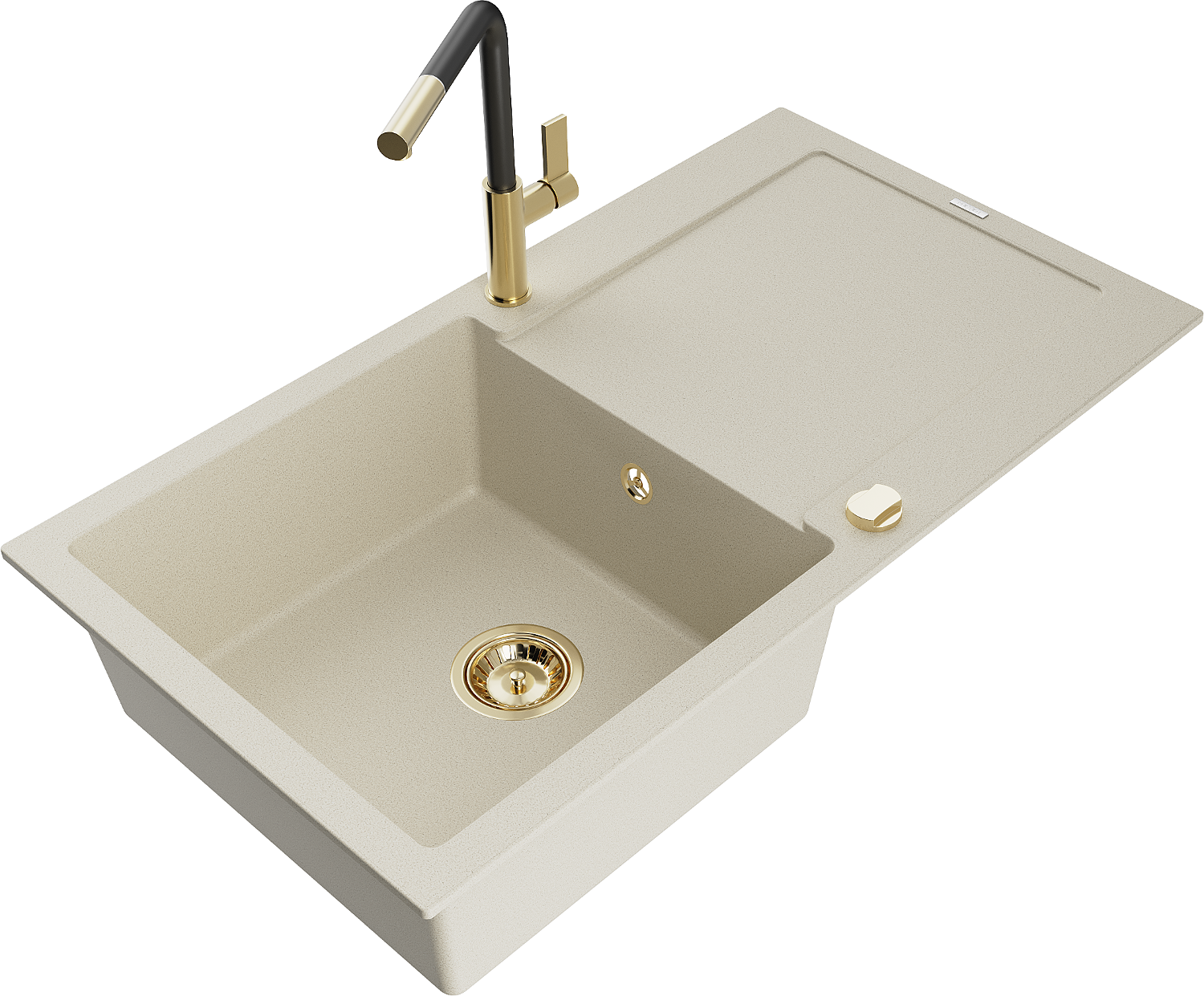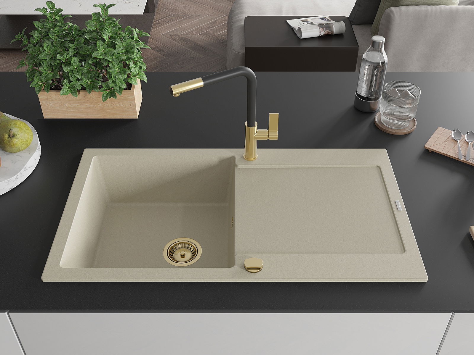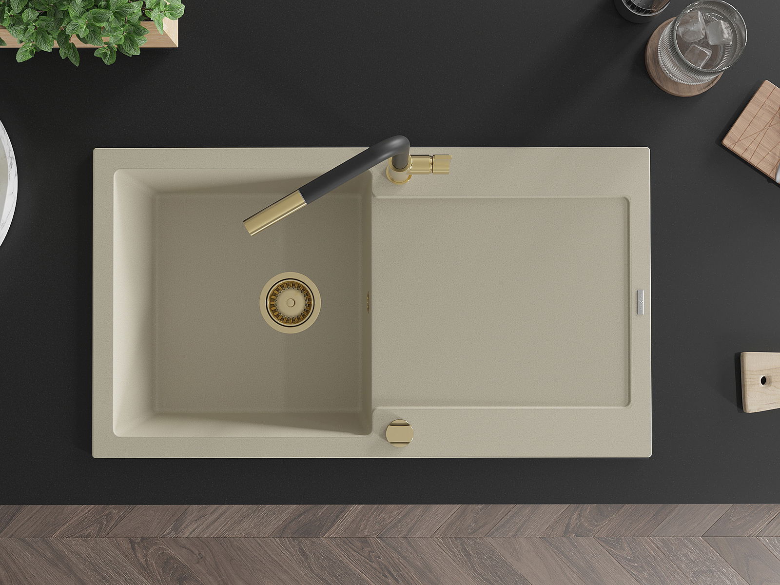 Mexen Leo jednokomorový žulový dřez s odkapávačem a kuchyňskou baterií Flora, béžový - 6501-69-670401-57-G