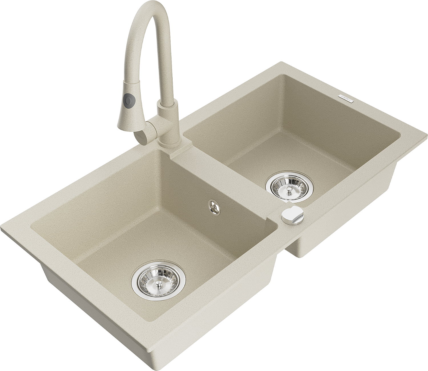 Mexen Mario dvoukomorový dřez z granitu s kuchyňskou baterií Elia, béžový - 6504-69-670101-69