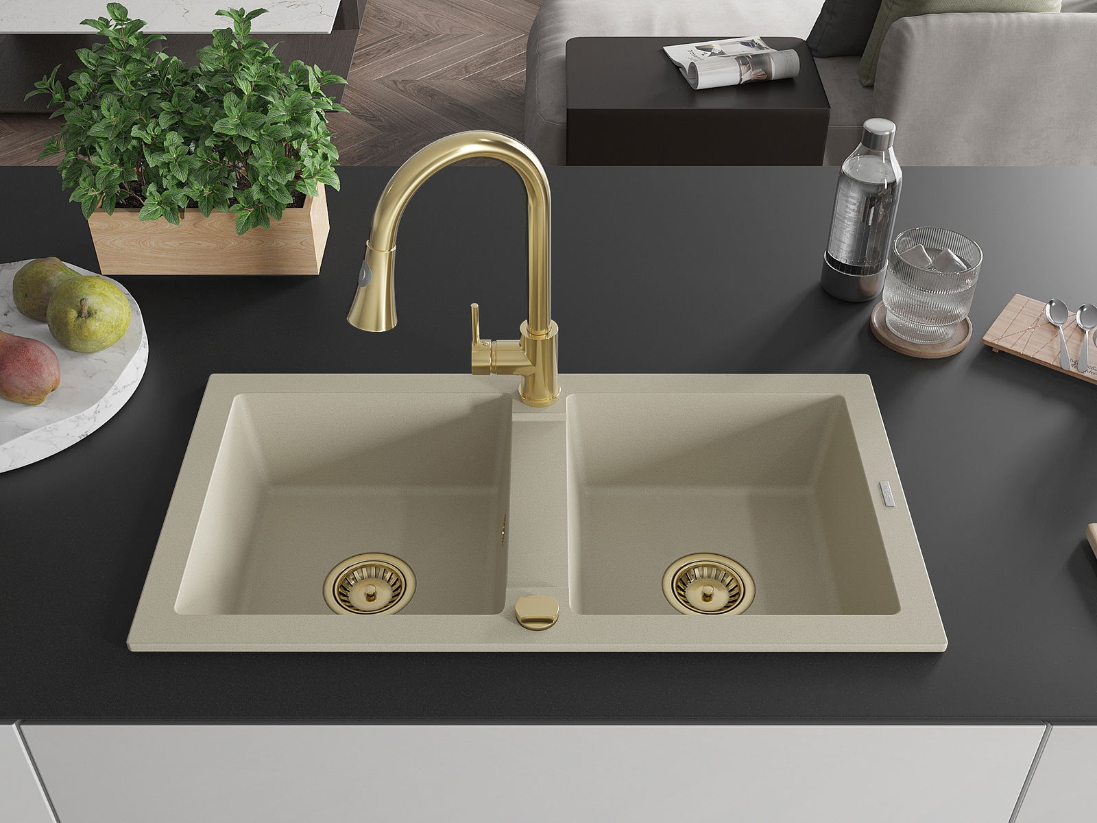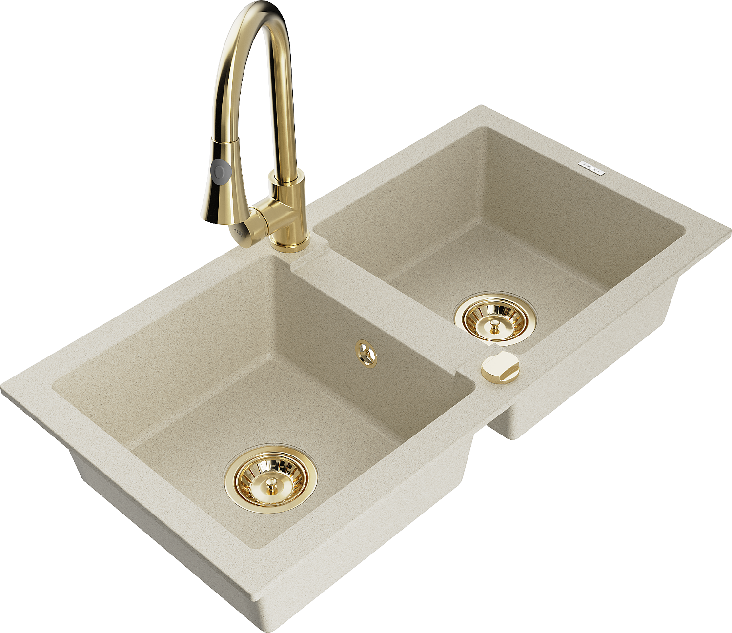Mexen Mario dvoukomorový granitový dřez s kuchyňskou baterií Elia, béžový - 6504-69-670101-50