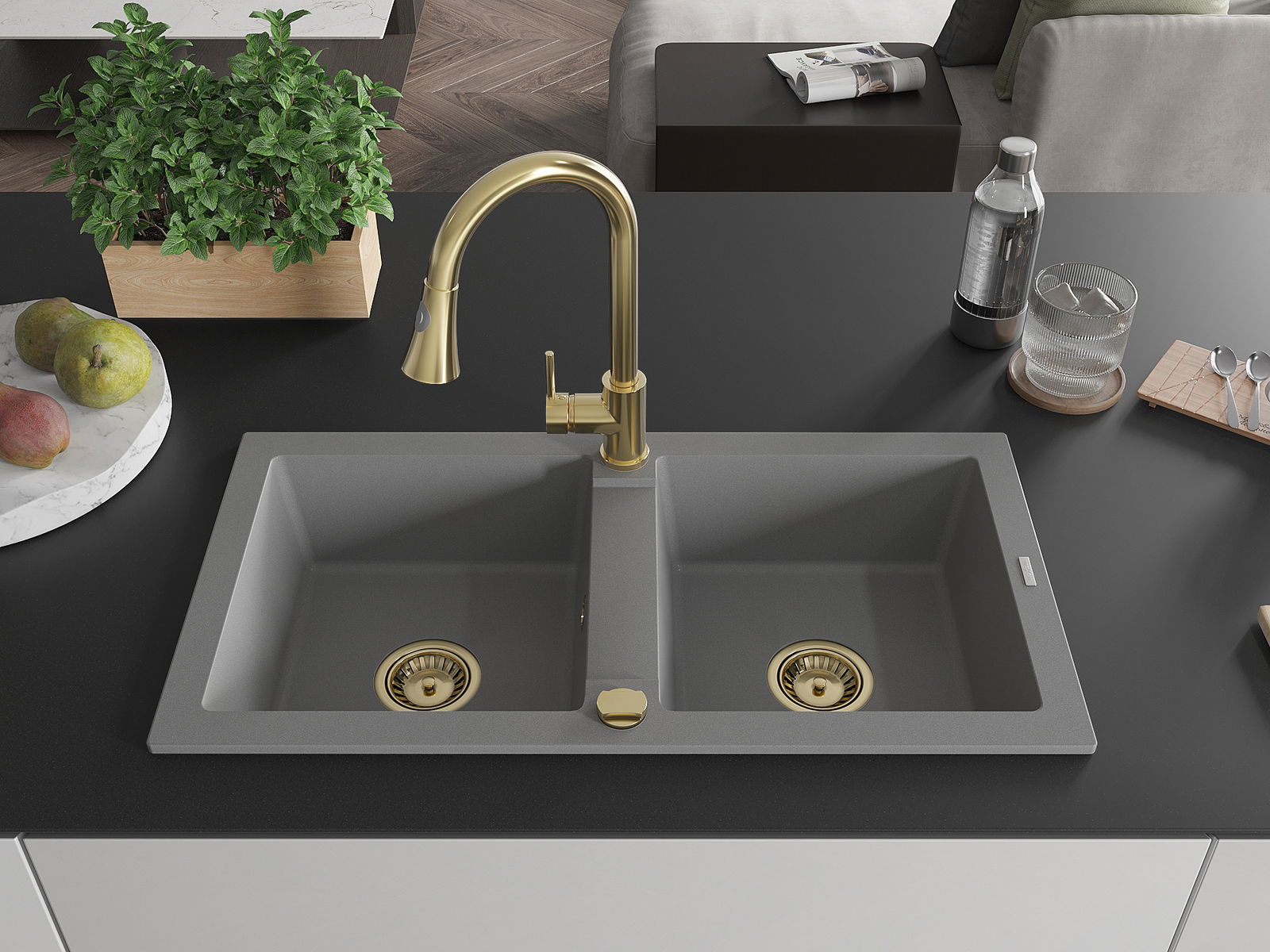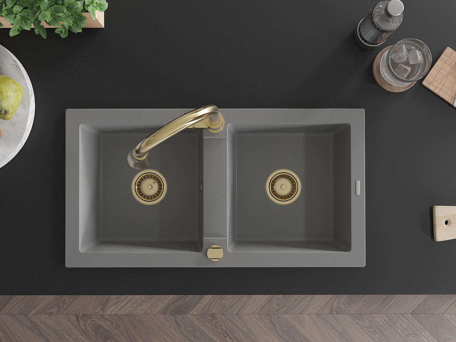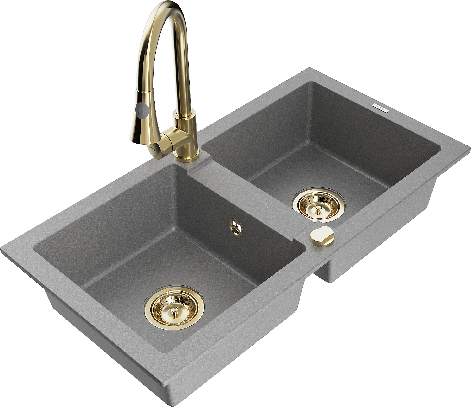 Mexen Mario granitový dřez dvoukomorový s kuchyňskou baterií Elia, šedý - 6504-71-670101-50