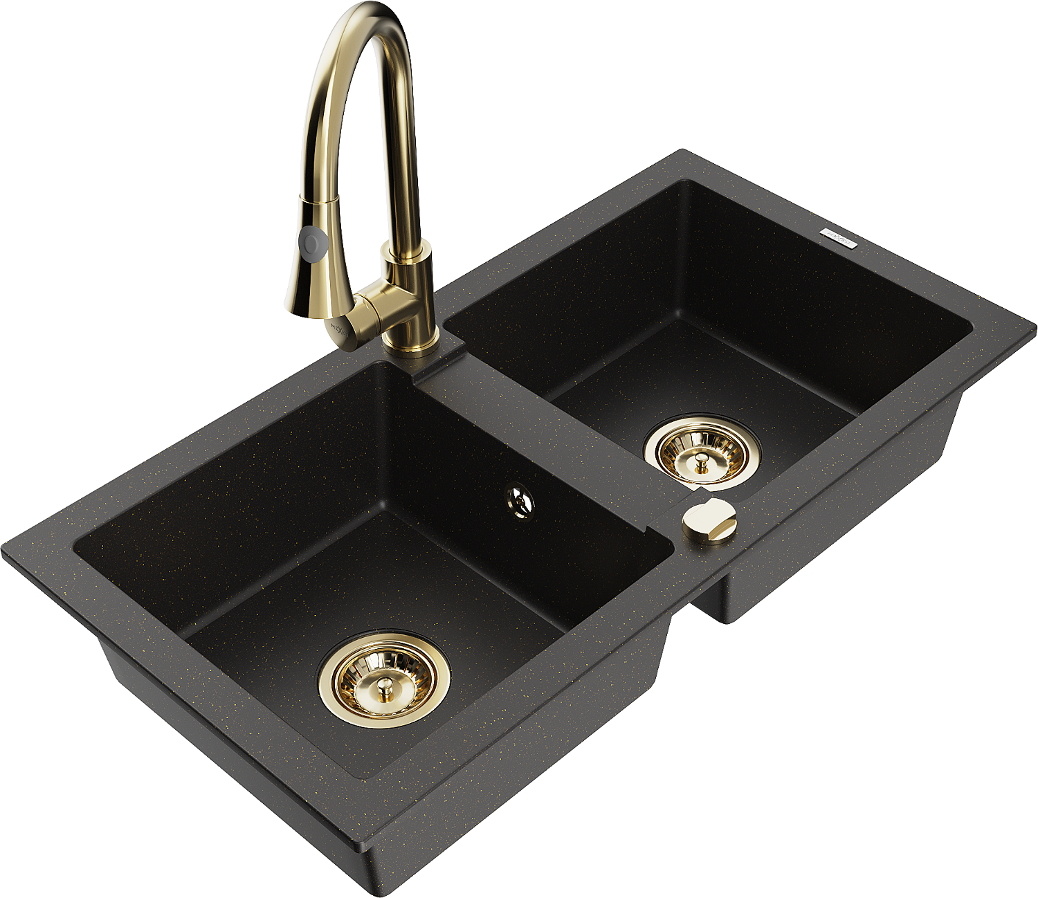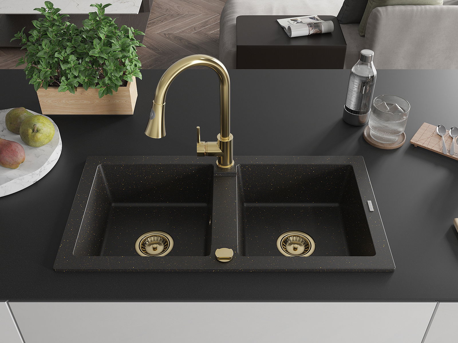 Mexen Mario dřez granitový 2-komorový s kuchyňskou baterií Elia, černý/zlatý metalik - 6504-75-670101-50