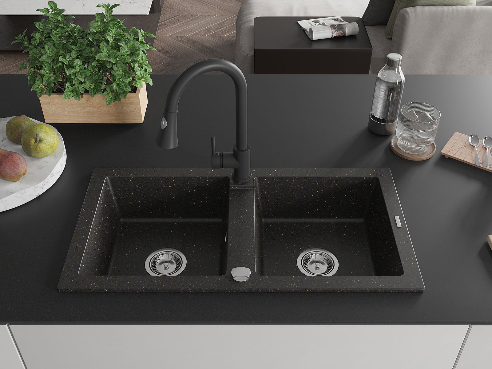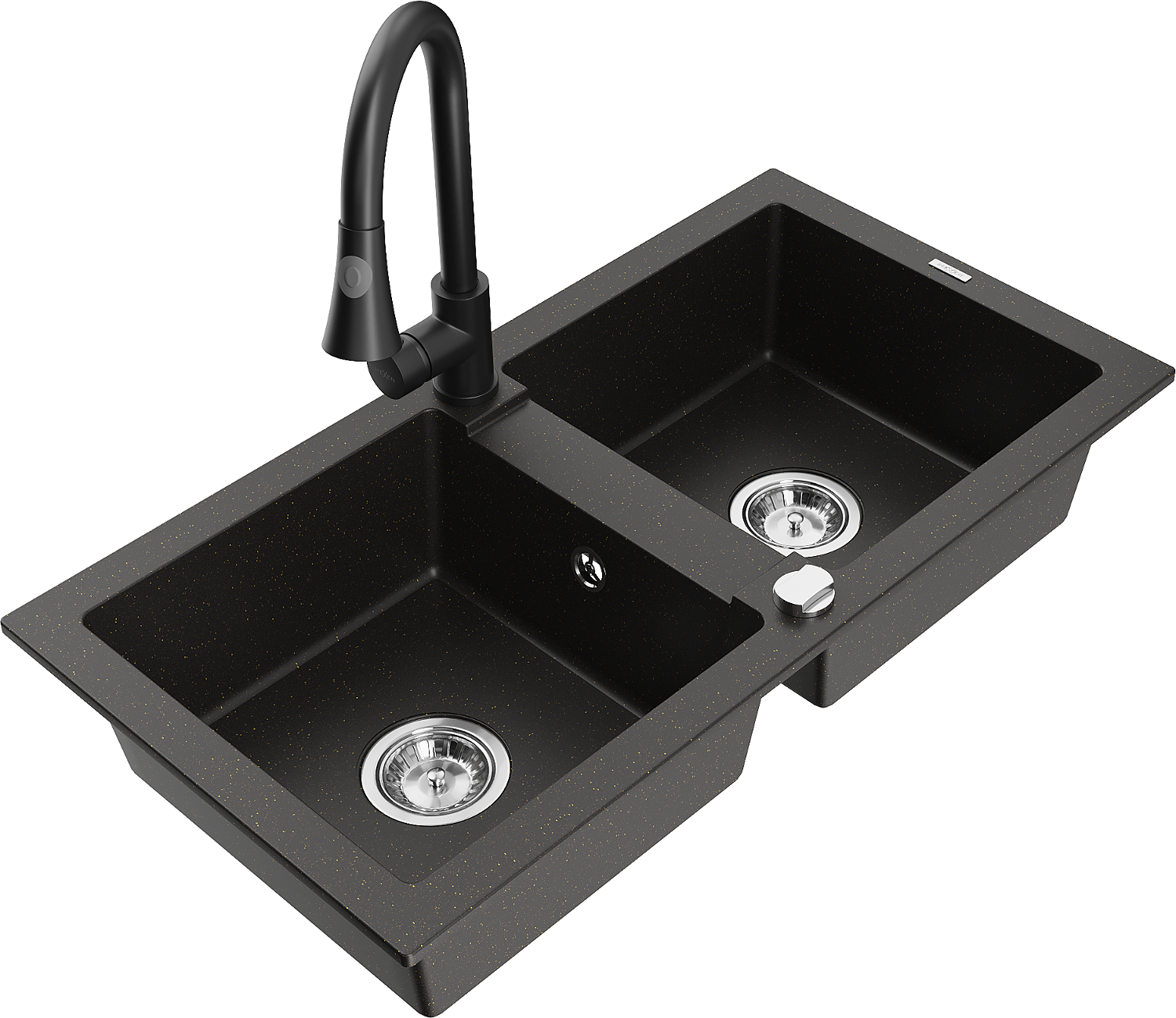Mexen Mario dřez granitový 2-komorový s kuchyňskou baterií Elia, černý/zlatý metalik - 6504-75-670101-70