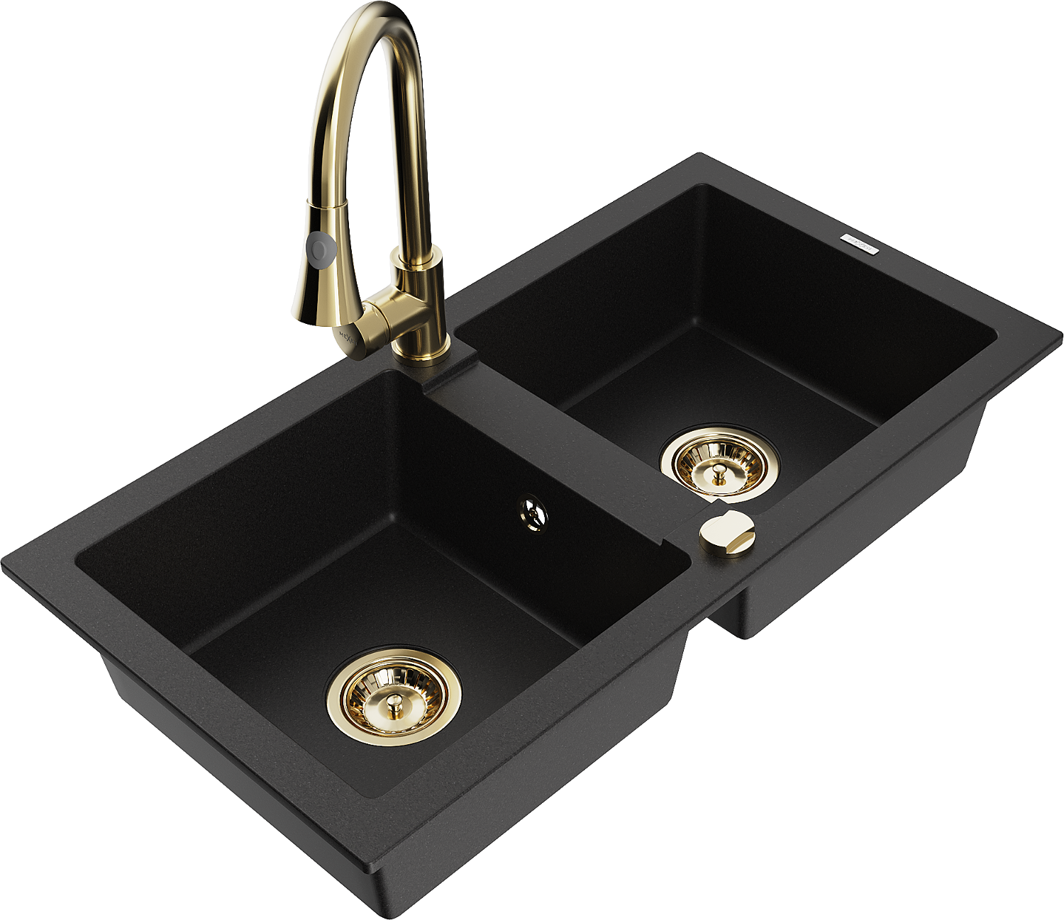 Mexen Mario žulový kuchyňský dřez 2-komorový s kuchyňskou baterií Elia, černý - 6504-77-670101-50
