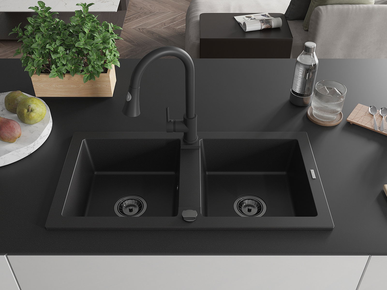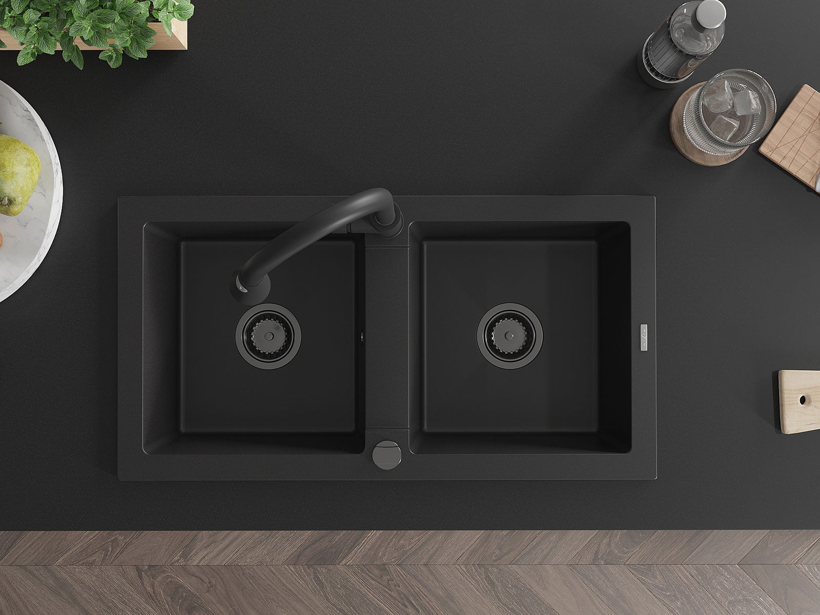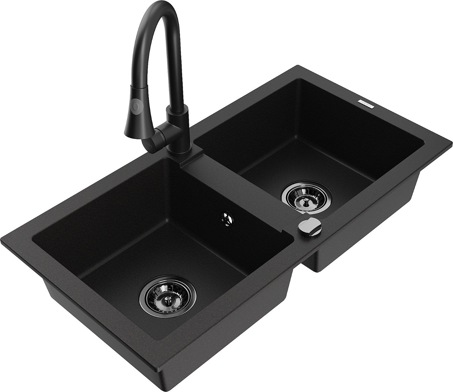 Mexen Mario granitový dřez 2-komorový s kuchyňskou baterií Elia, černý - 6504-77-670101-70-B