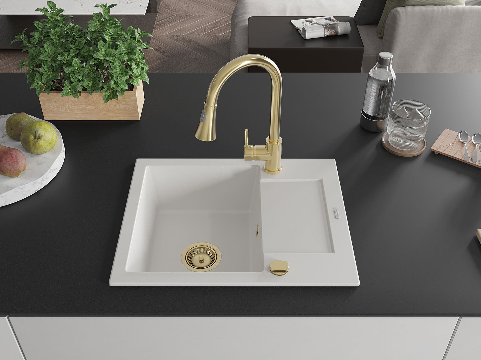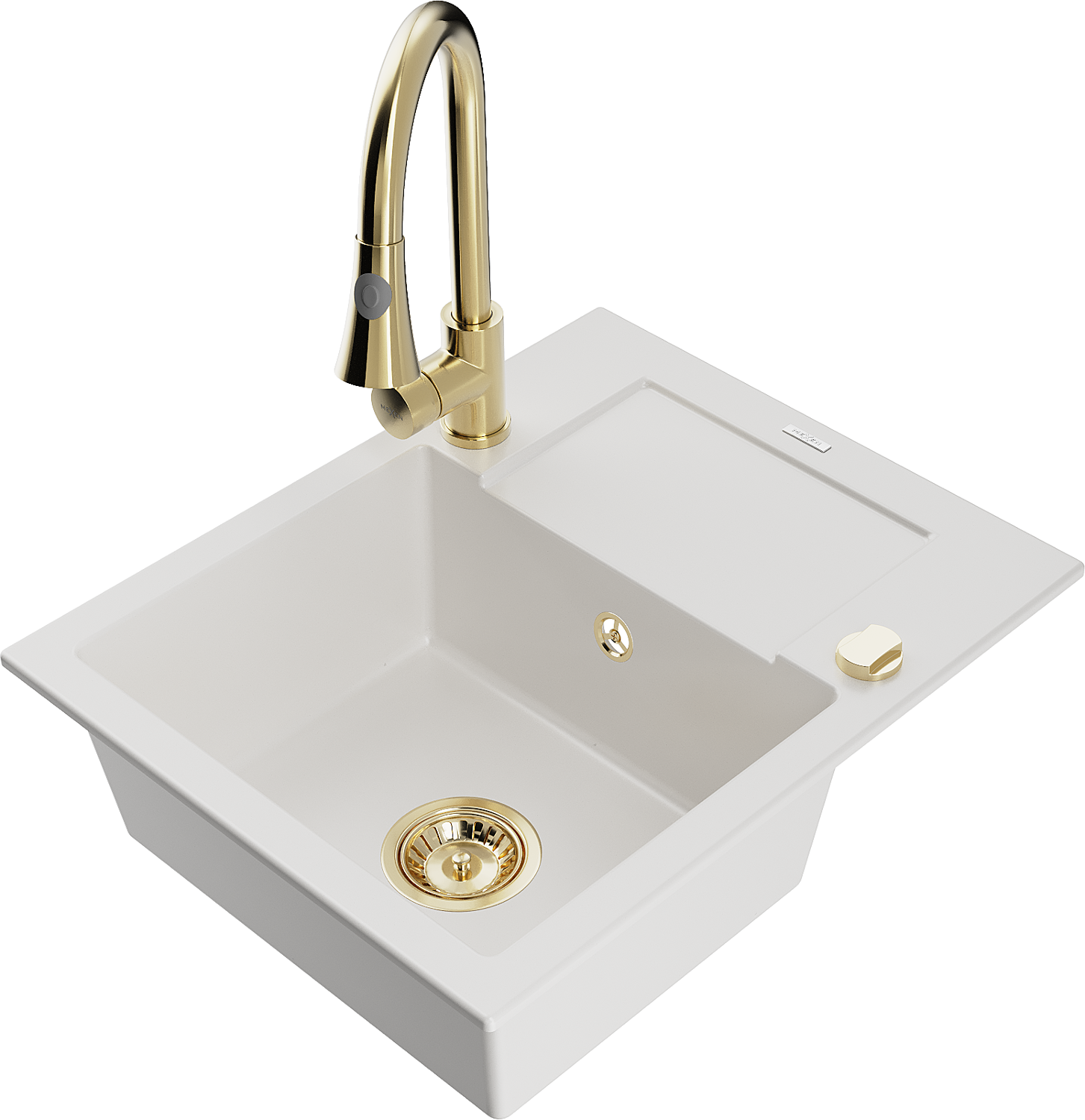 Mexen Enzo granitový dřez s 1 komorou, odkapávačem a kuchyňskou baterií Elia, bílý - 6506-20-670101-50
