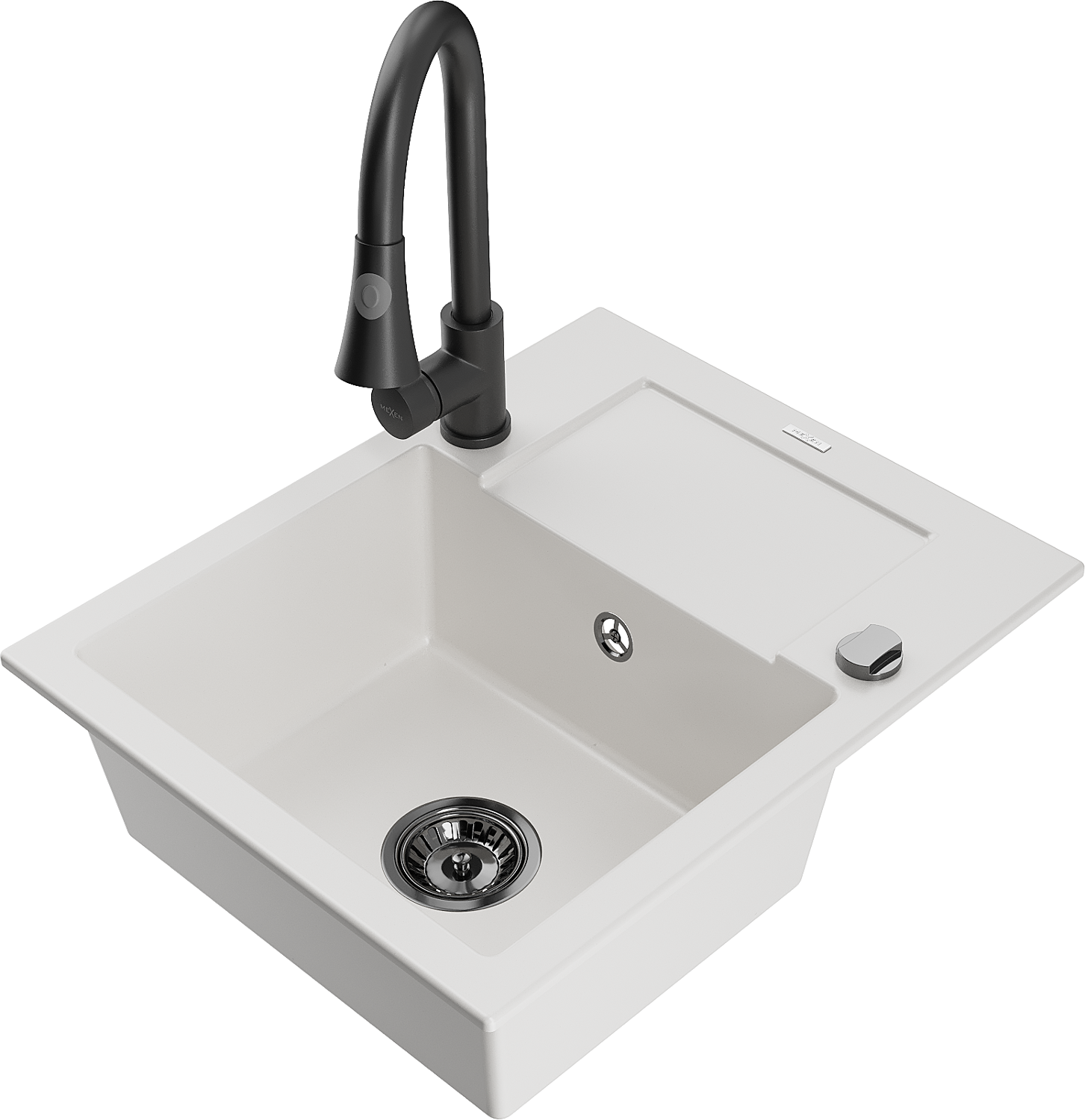 Mexen Enzo granitový dřez s 1 komorou a odkapávačem a kuchyňskou baterií Elia, bílý - 6506-20-670101-70