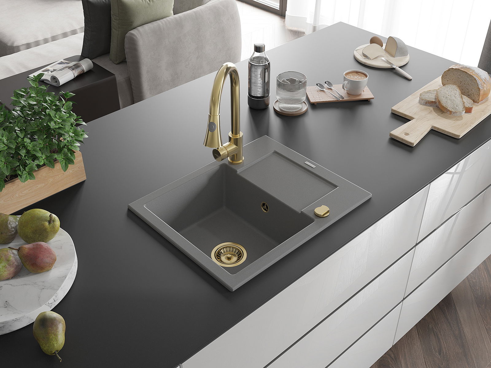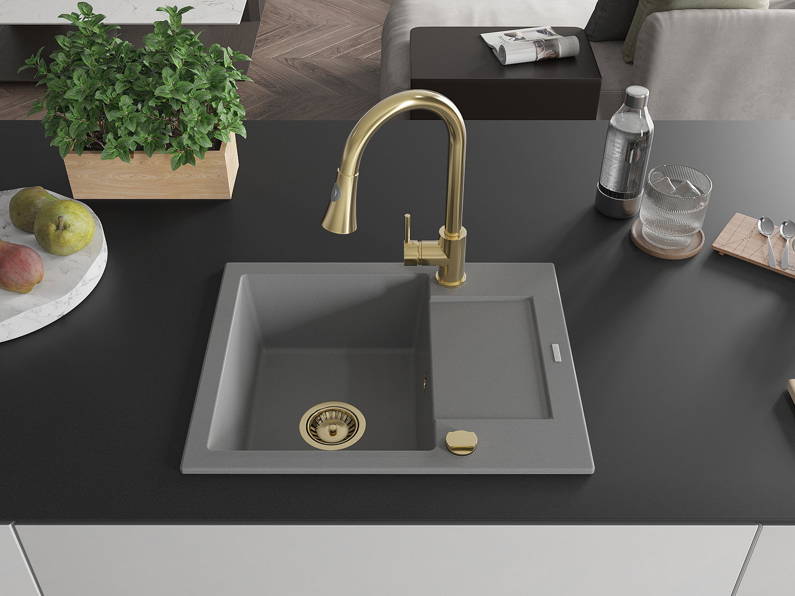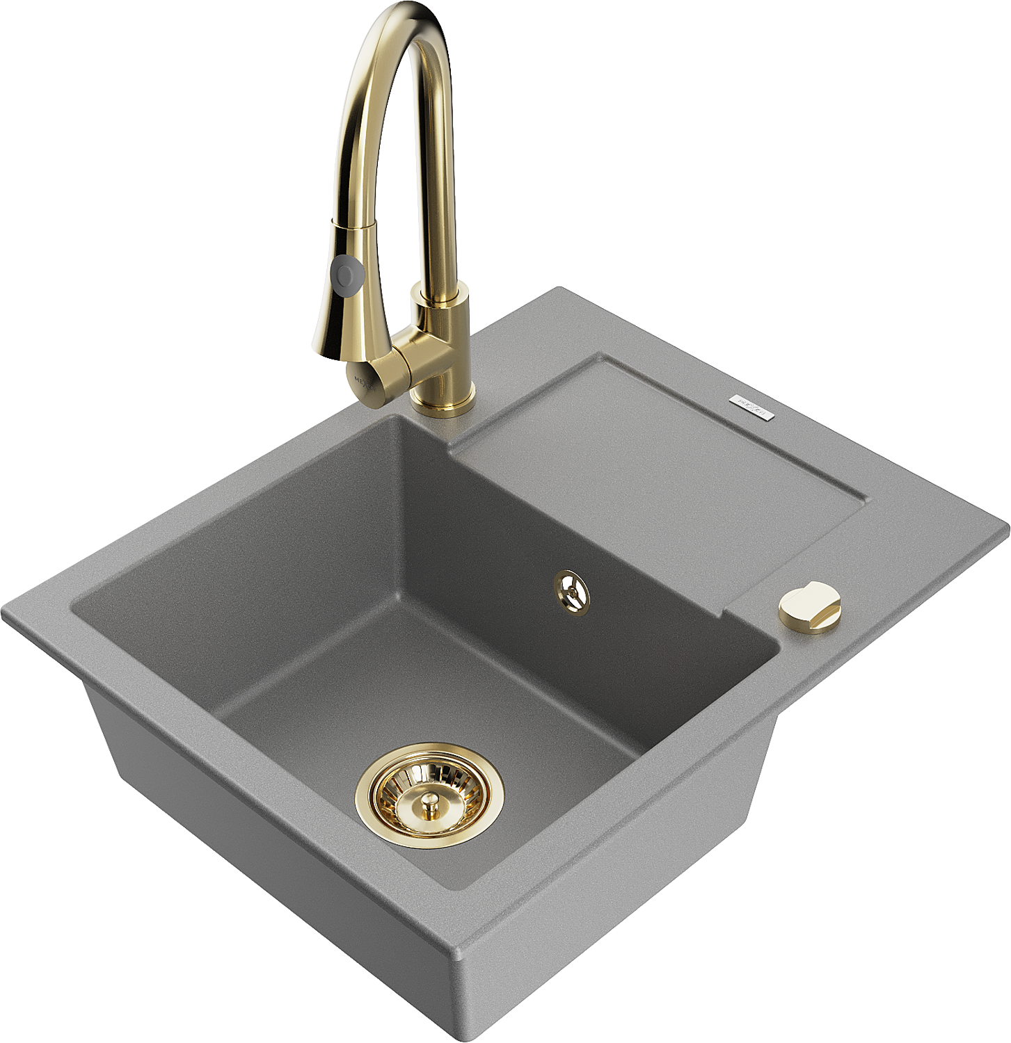 Mexen Enzo granitový dřez 1-komorový s odkapávačem a kuchyňskou baterií Elia, šedý - 6506-71-670101-50