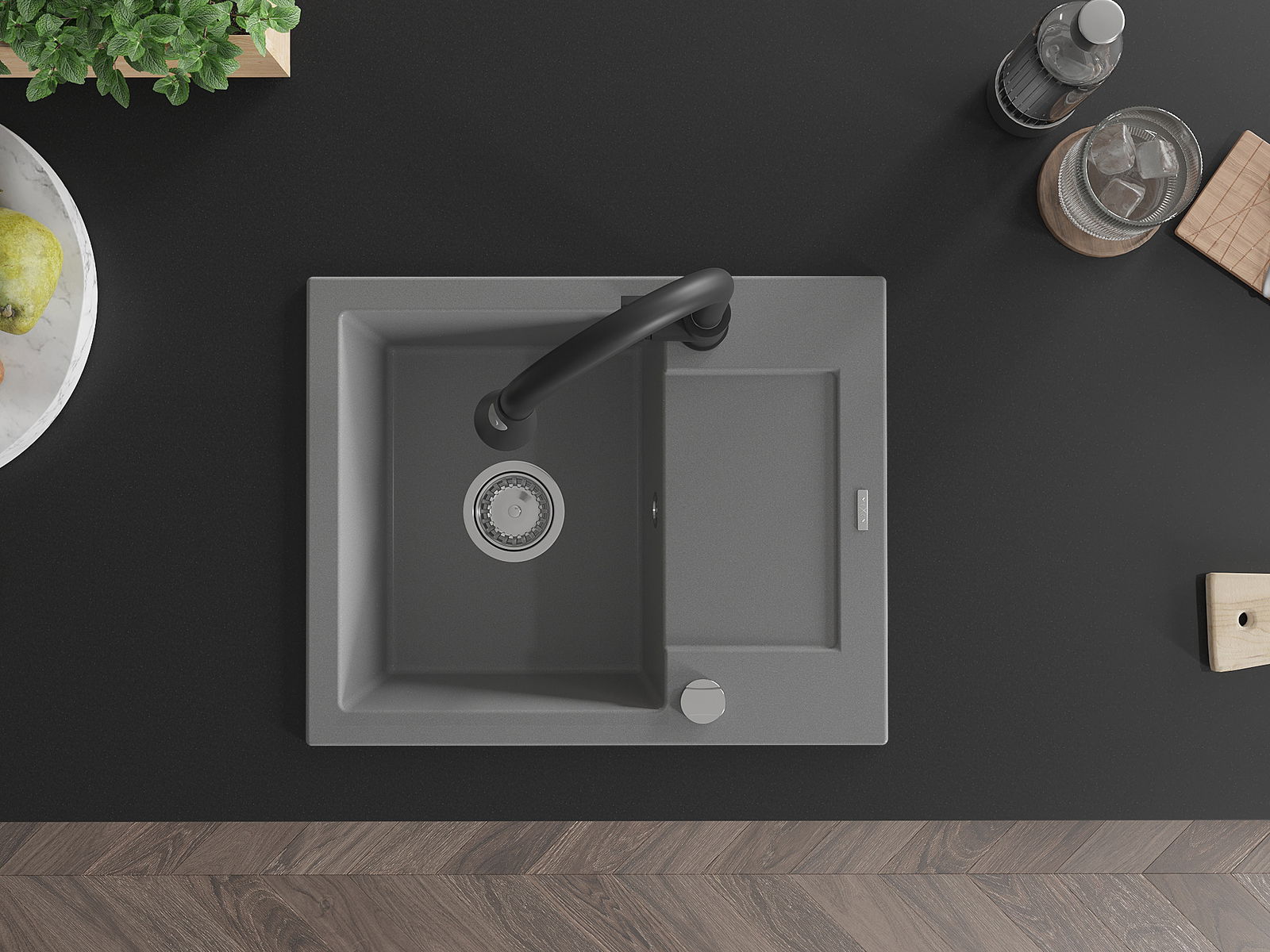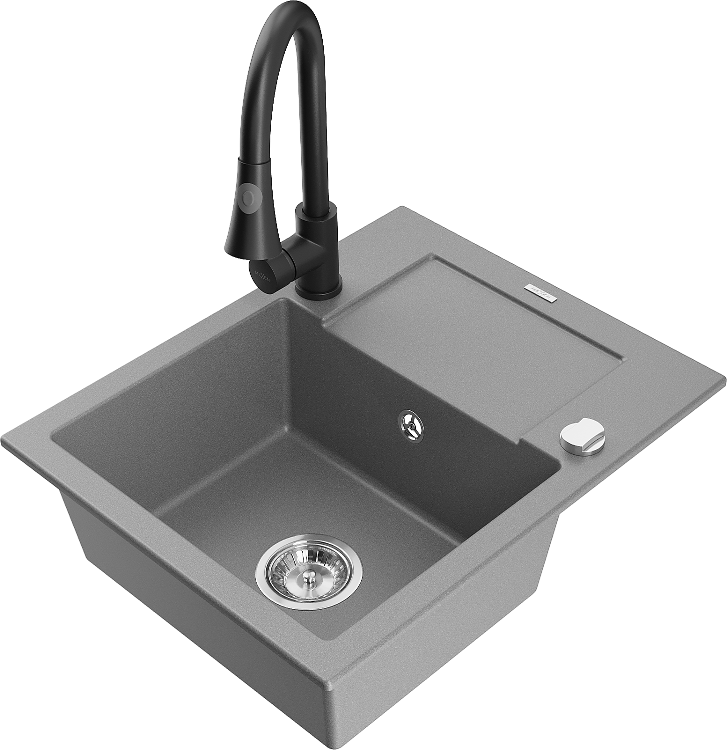 Mexen Enzo granitový dřez s 1 komorou s odkapávačem a kuchyňskou baterií Elia, šedý - 6506-71-670101-70