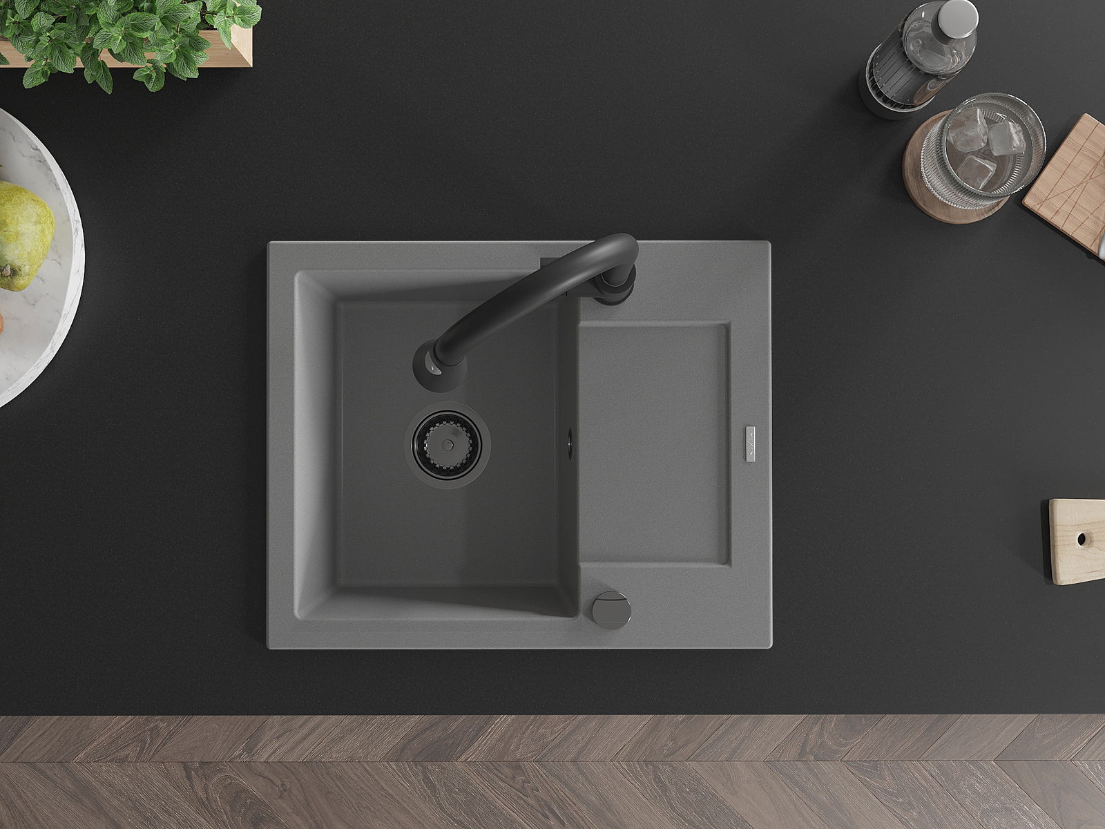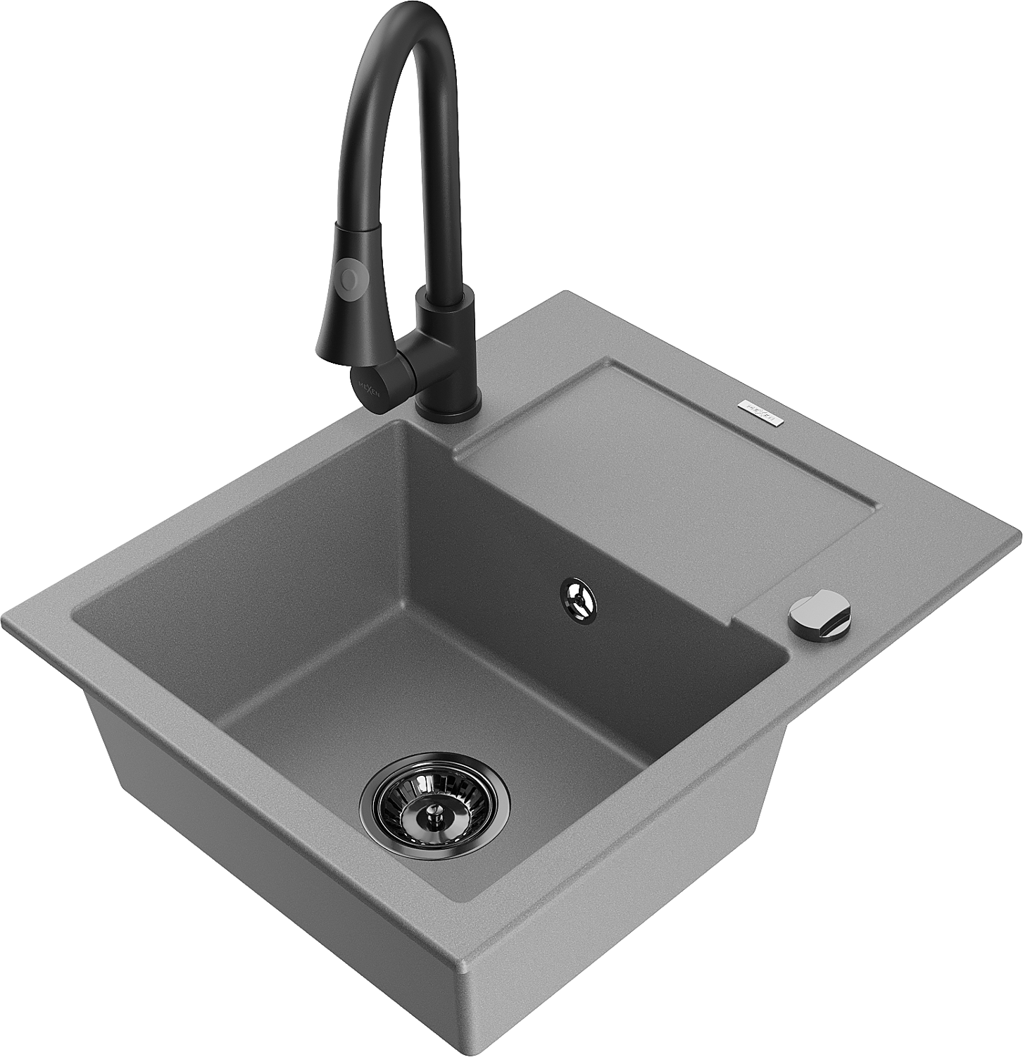 Mexen Enzo granitový dřez s jednou komorou a odkapávačem a kuchyňskou baterií Elia, šedý - 6506-71-670101-70-B