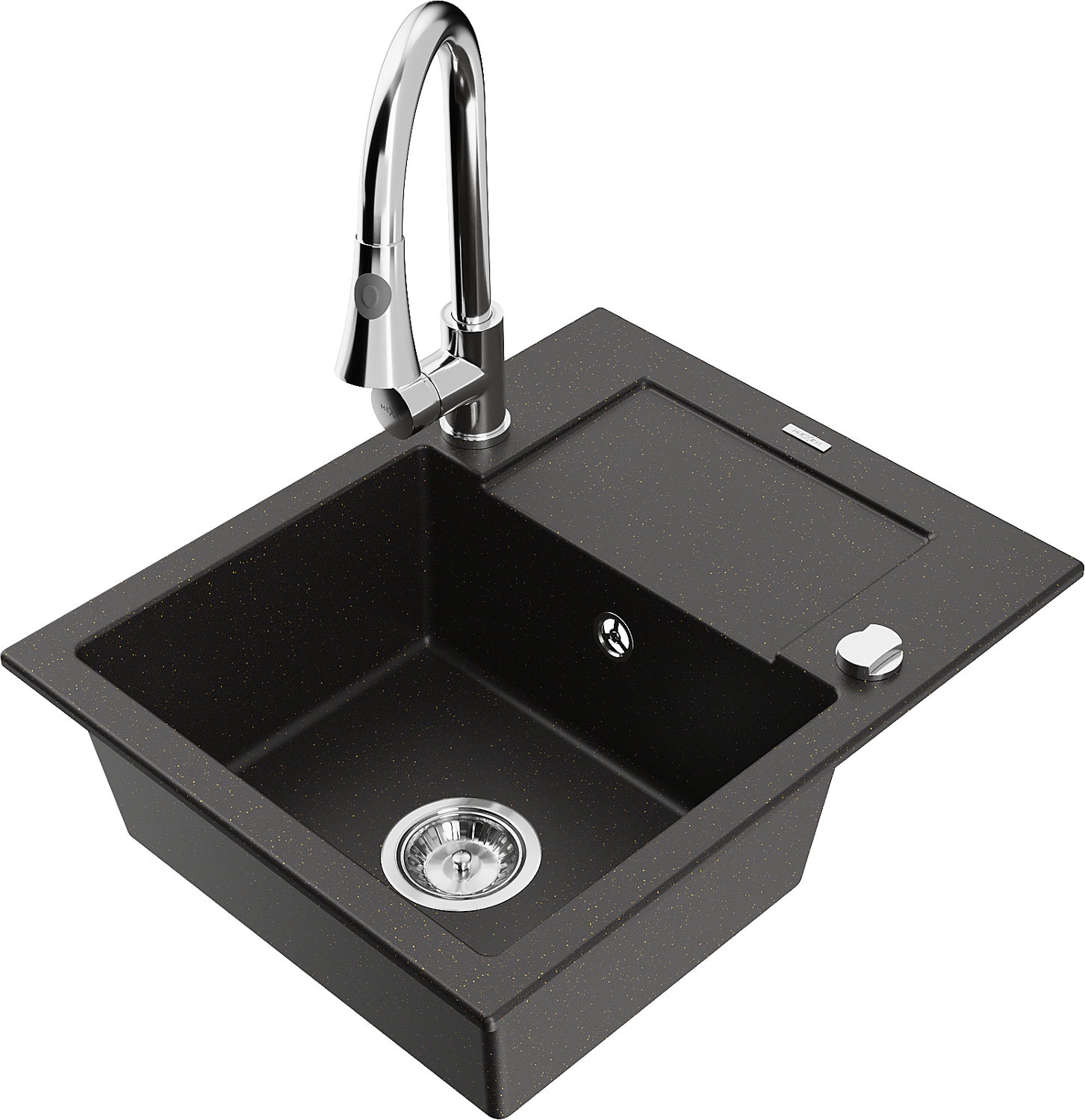 Mexen Enzo granitový dřez s 1 komorou, odkapávačem a kuchyňskou baterií Elia, černý/zlatý metalický - 6506-75-670101-00