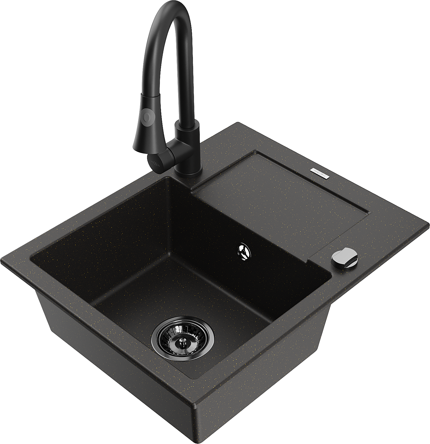 Mexen Enzo granitový dřez s jednou komorou a odkapávačem a kuchyňskou baterií Elia, černý/zlatý metalický - 6506-75-670101-70-B