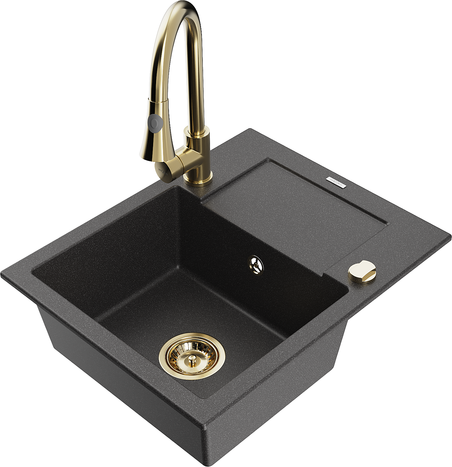 Mexen Enzo granitový dřez s 1 komorou a odkapávačem, kuchyňská baterie Elia, černý skvrnitý - 6506-76-670101-50
