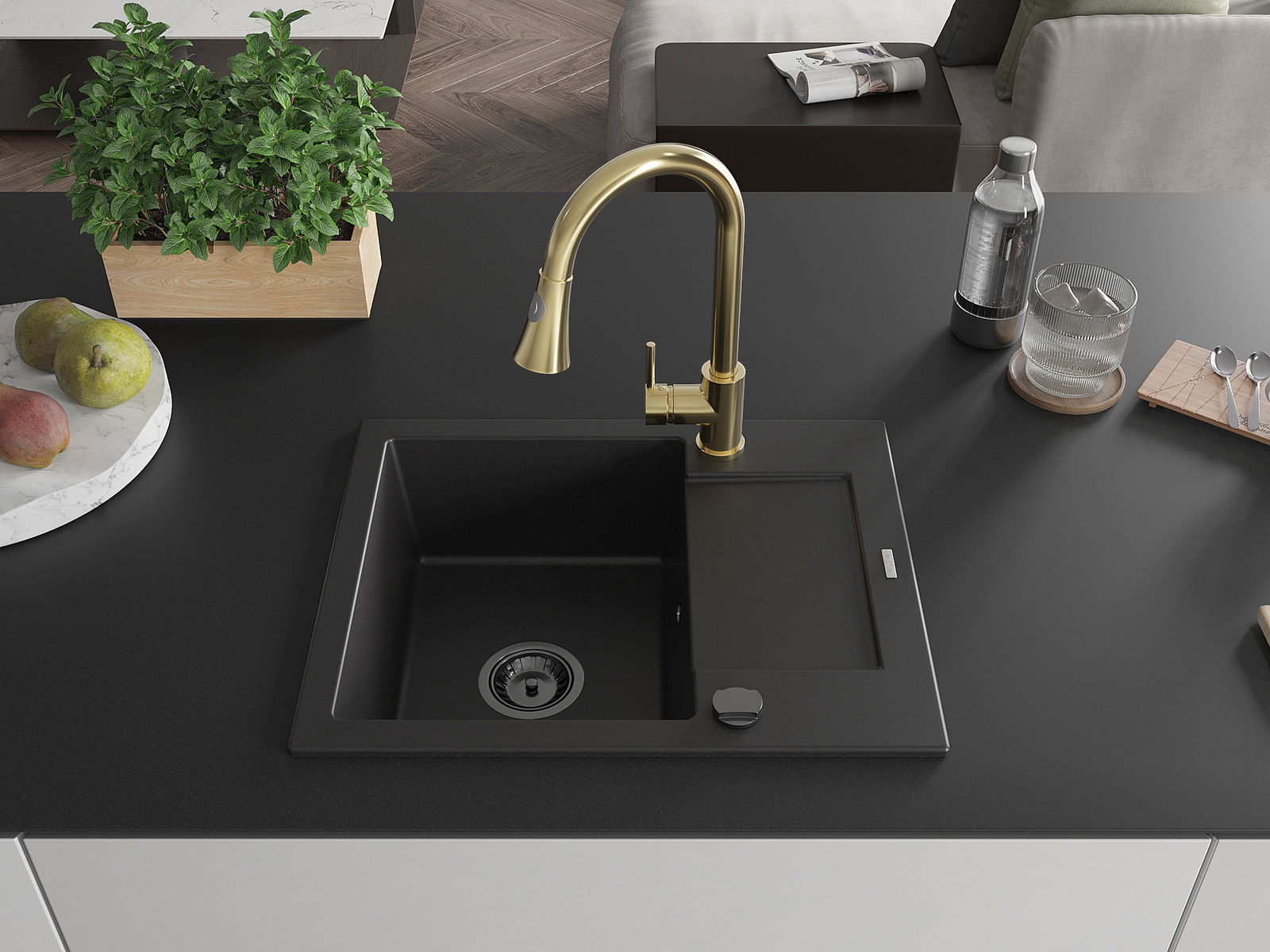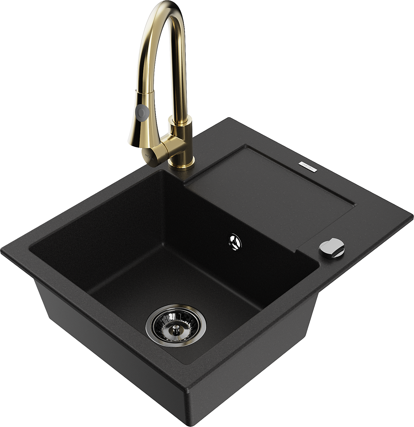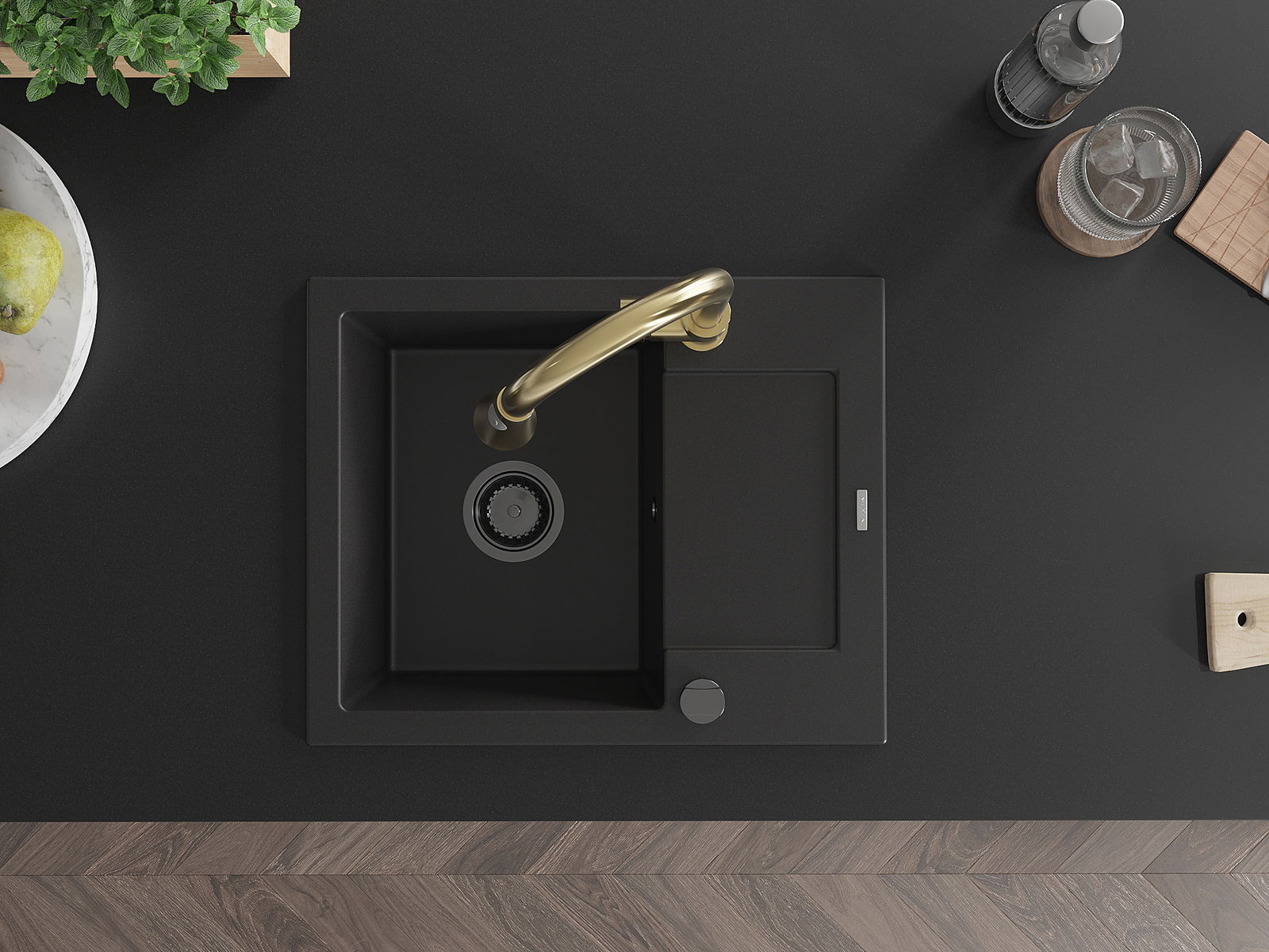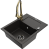 Mexen Enzo granitový kuchyňský dřez 1-komorový s odkapávačem a kuchyňskou baterií Elia, černý - 6506-77-670101-50-B