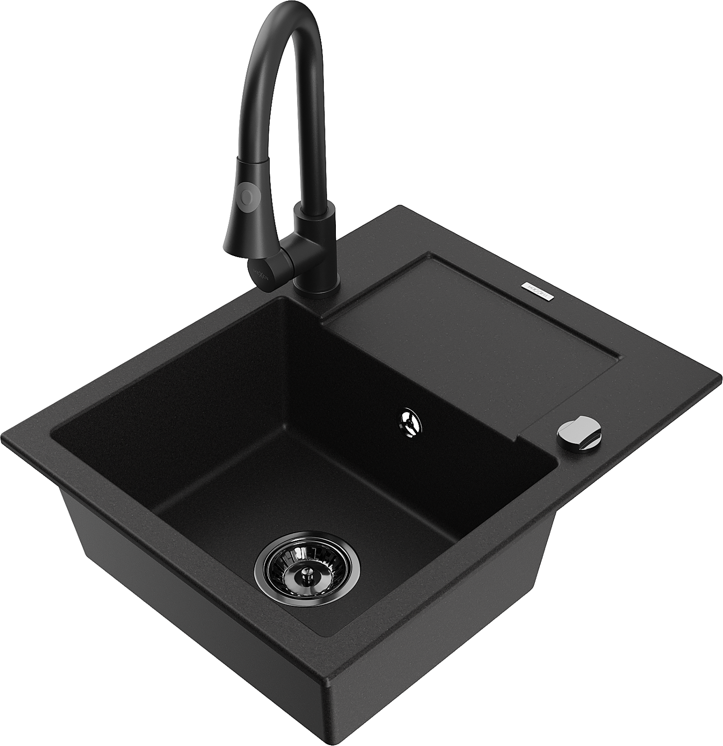 Mexen Enzo granitový dřez 1-komorový s odkapávačem a kuchyňskou baterií Elia, černý - 6506-77-670101-70-B