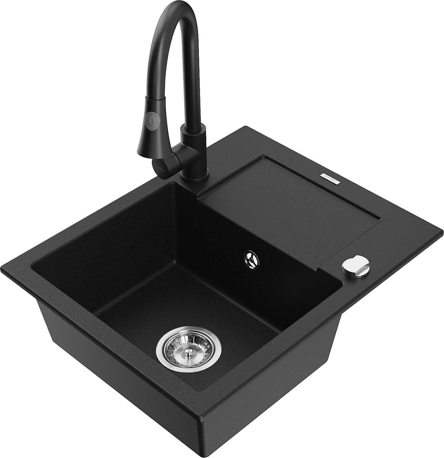 Mexen Enzo granitový dřez 1-komorový s odkapávačem a kuchyňskou baterií Elia, černý - 6506-77-670101-70
