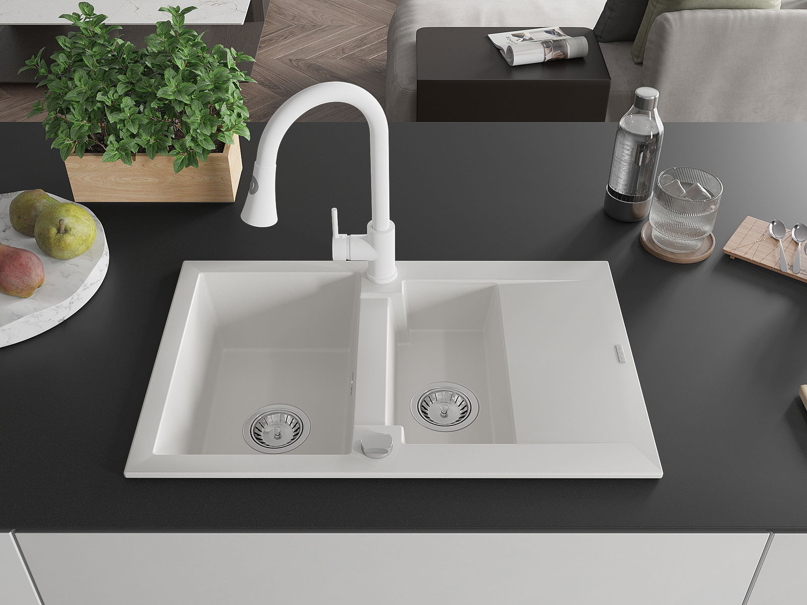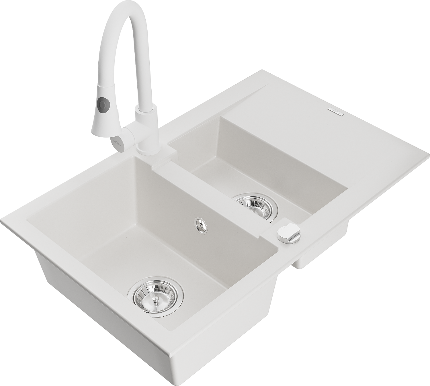 Mexen Gaspar granitový dřez 1,5-komorový s odkapávačem a kuchyňskou baterií Elia, bílý - 6507-20-670101-20