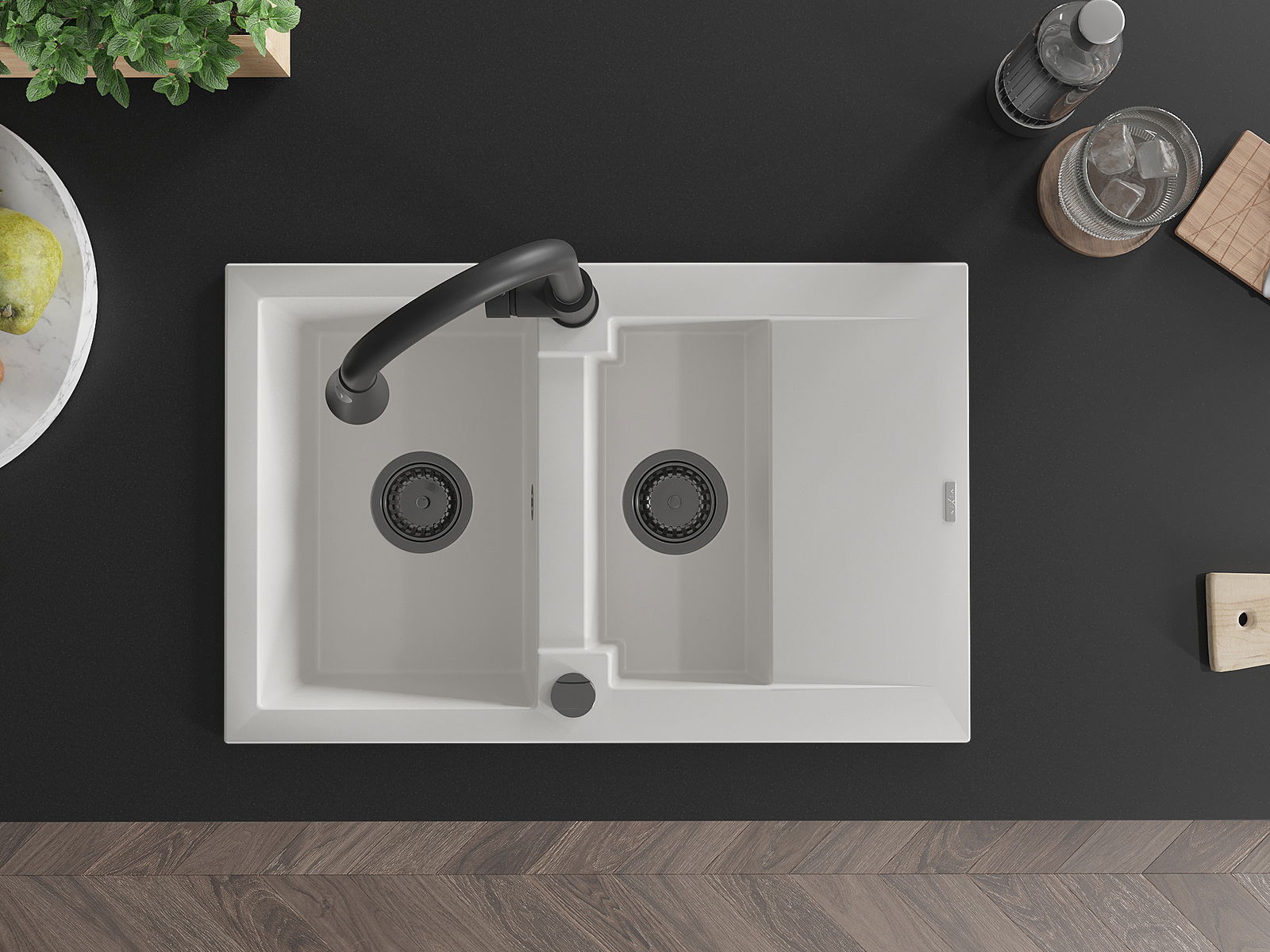Mexen Gaspar granitový dřez 1,5-komorový s odkapávačem a kuchyňskou baterií Elia, bílý - 6507-20-670101-70