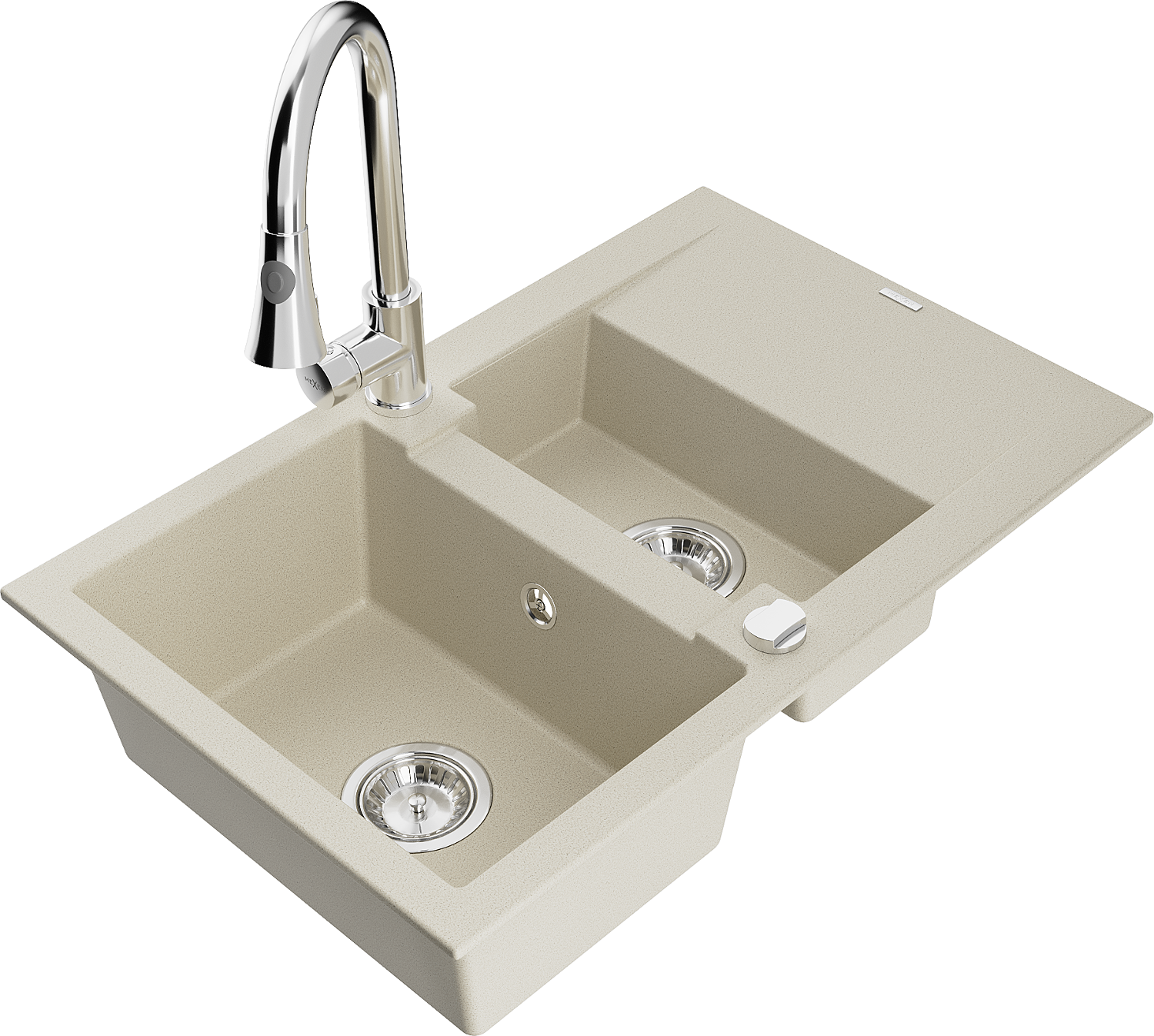 Mexen Gaspar granitový dřez 1,5-komorový s odkapávačem a kuchyňskou baterií Elia, béžový - 6507-69-670101-00