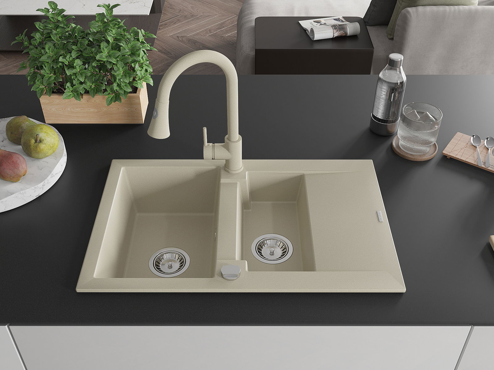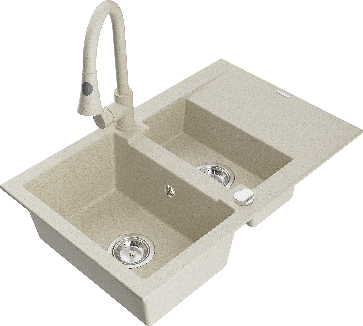 Mexen Gaspar žulový dřez 1,5-komorový s odkapávačem a kuchyňskou baterií Elia, béžový - 6507-69-670101-69