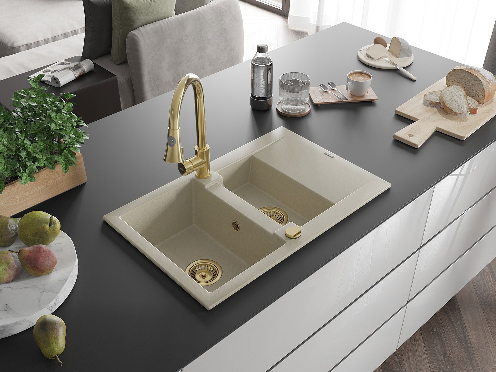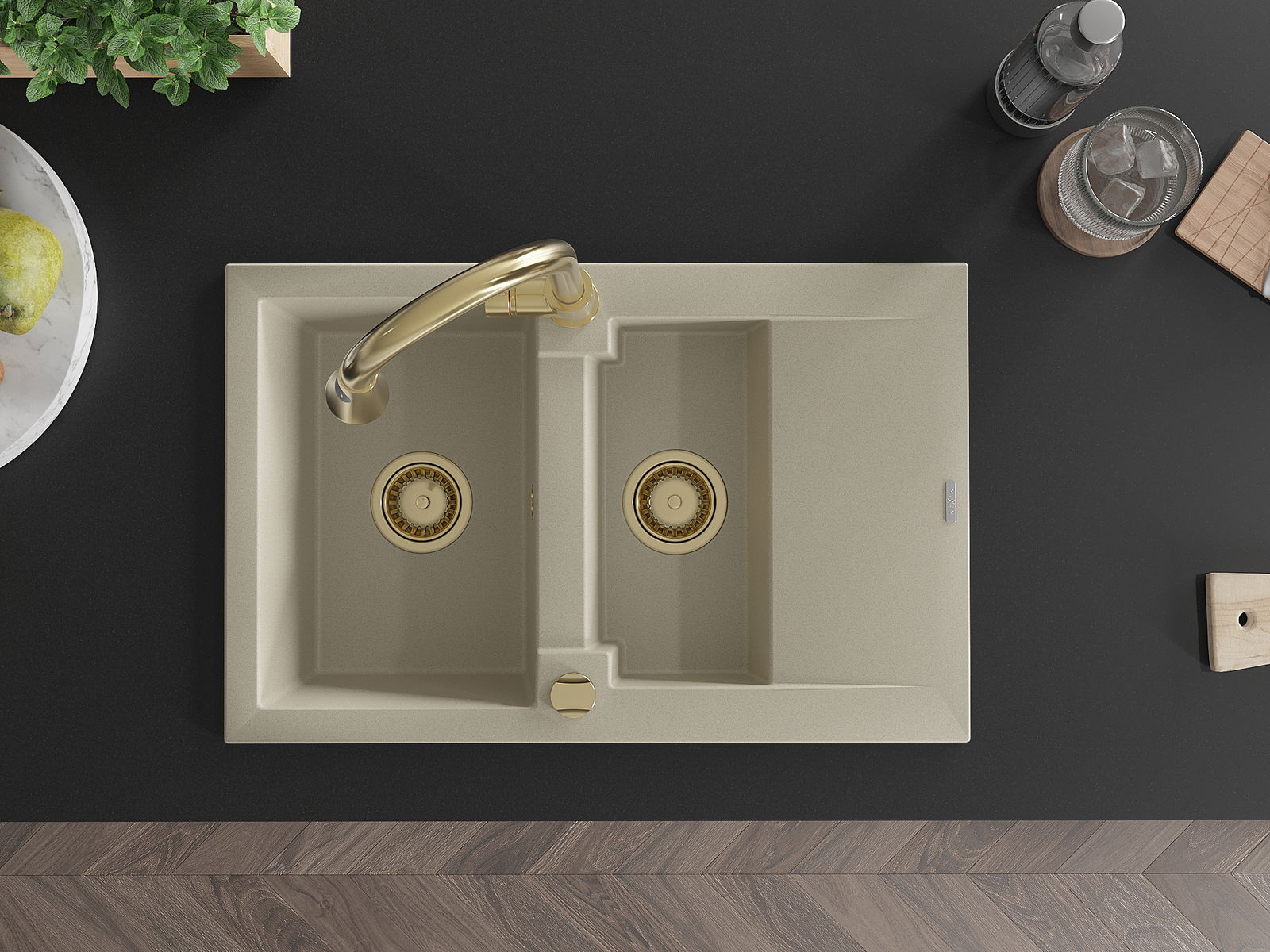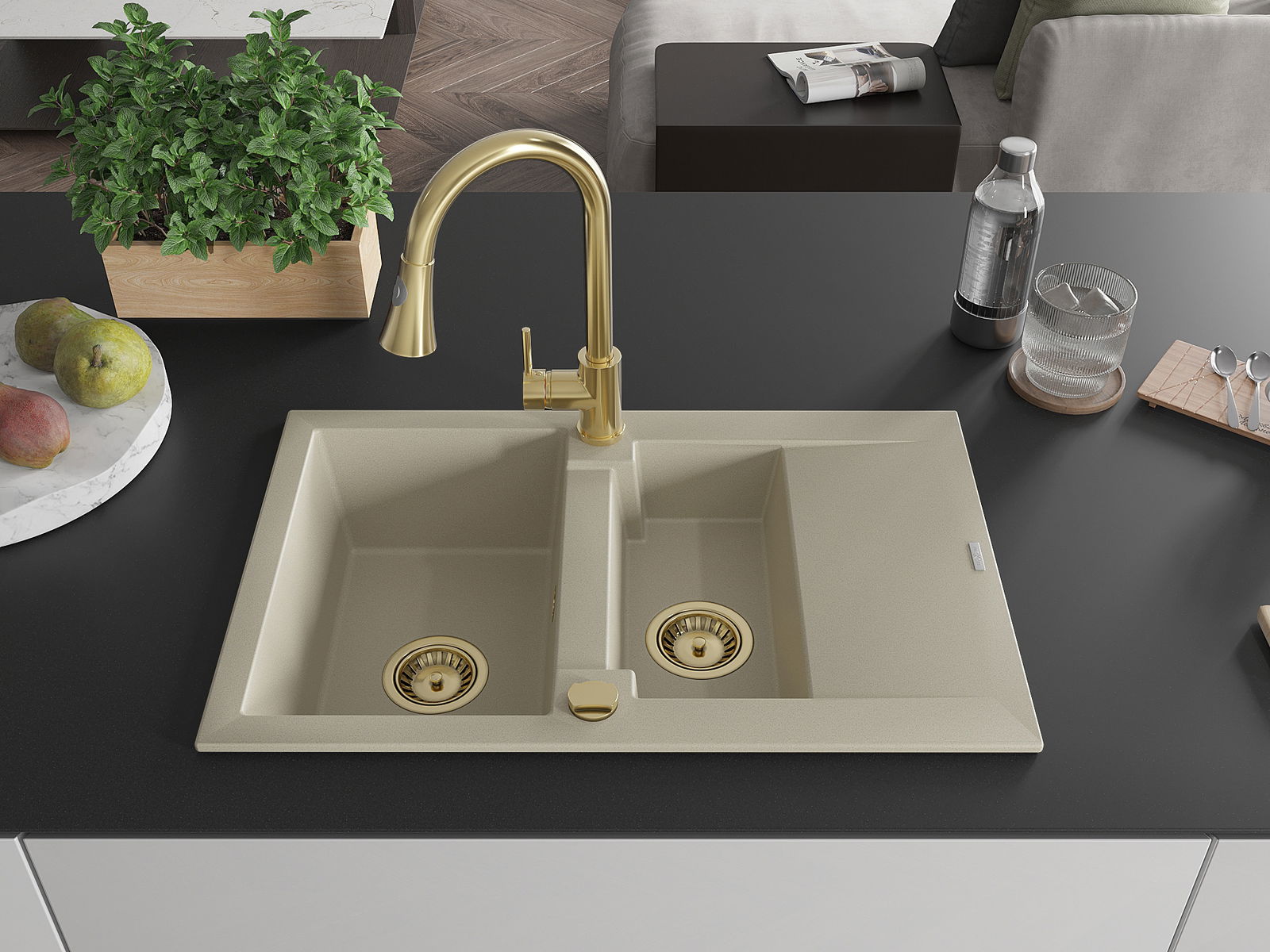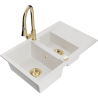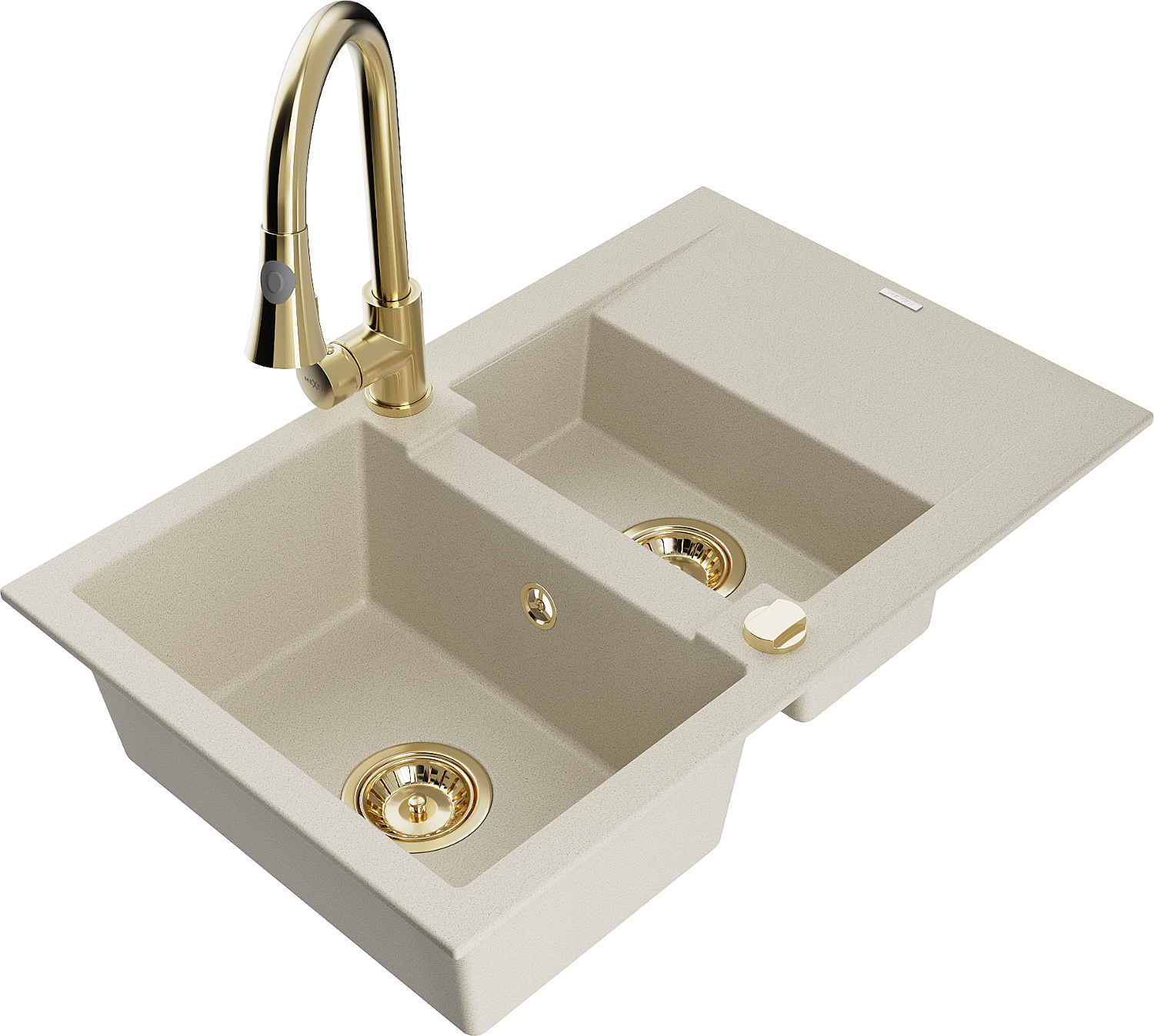 Mexen Gaspar granitový dřez 1,5-komorový s odkapávačem a kuchyňskou baterií Elia, béžový - 6507-69-670101-50