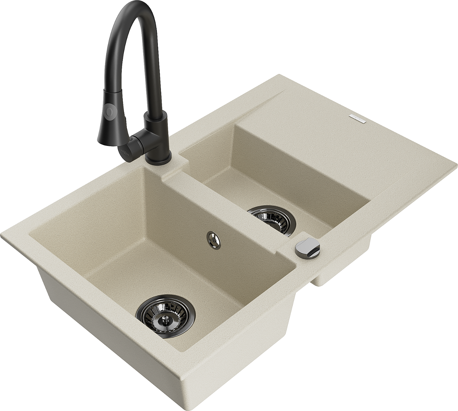 Mexen Gaspar granitový dřez 1,5-komorový s odkapávačem a kuchyňskou baterií Elia, béžový - 6507-69-670101-70