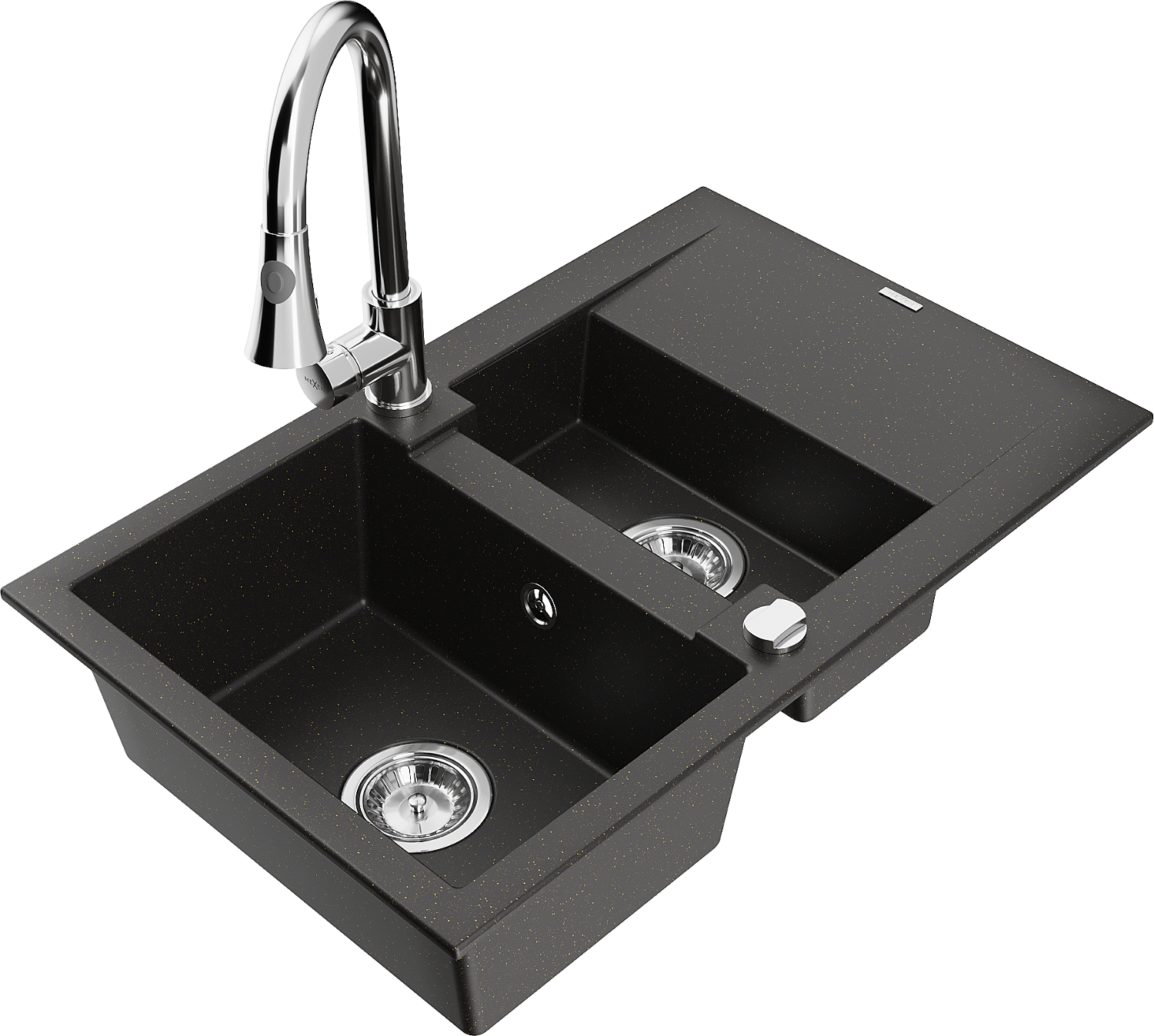 Mexen Gaspar granitový dřez 1,5-komorový s odkapávačem a kuchyňskou baterií Elia, černá/zlatý metalický - 6507-75-670101-00