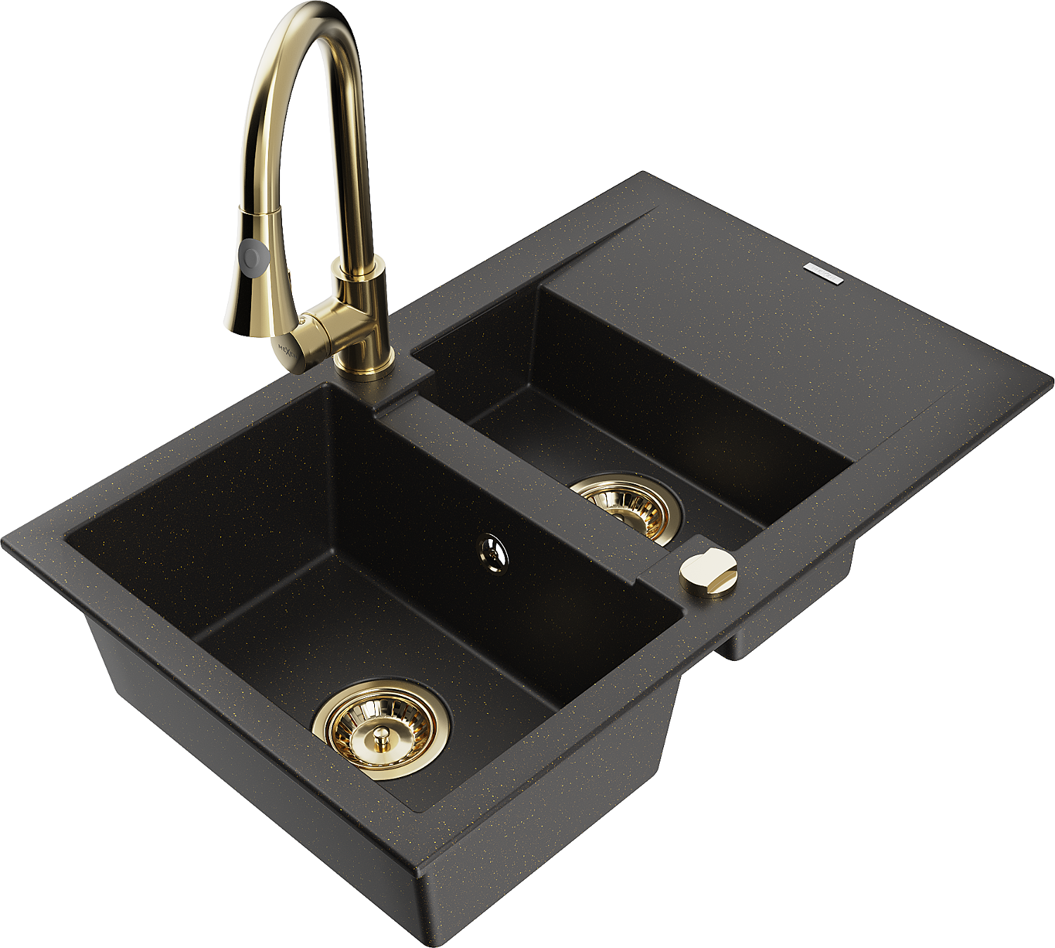 Mexen Gaspar granitový dřez 1,5-komorový s odkapávačem a kuchyňskou baterií Elia, černý/zlatý metalik - 6507-75-670101-50