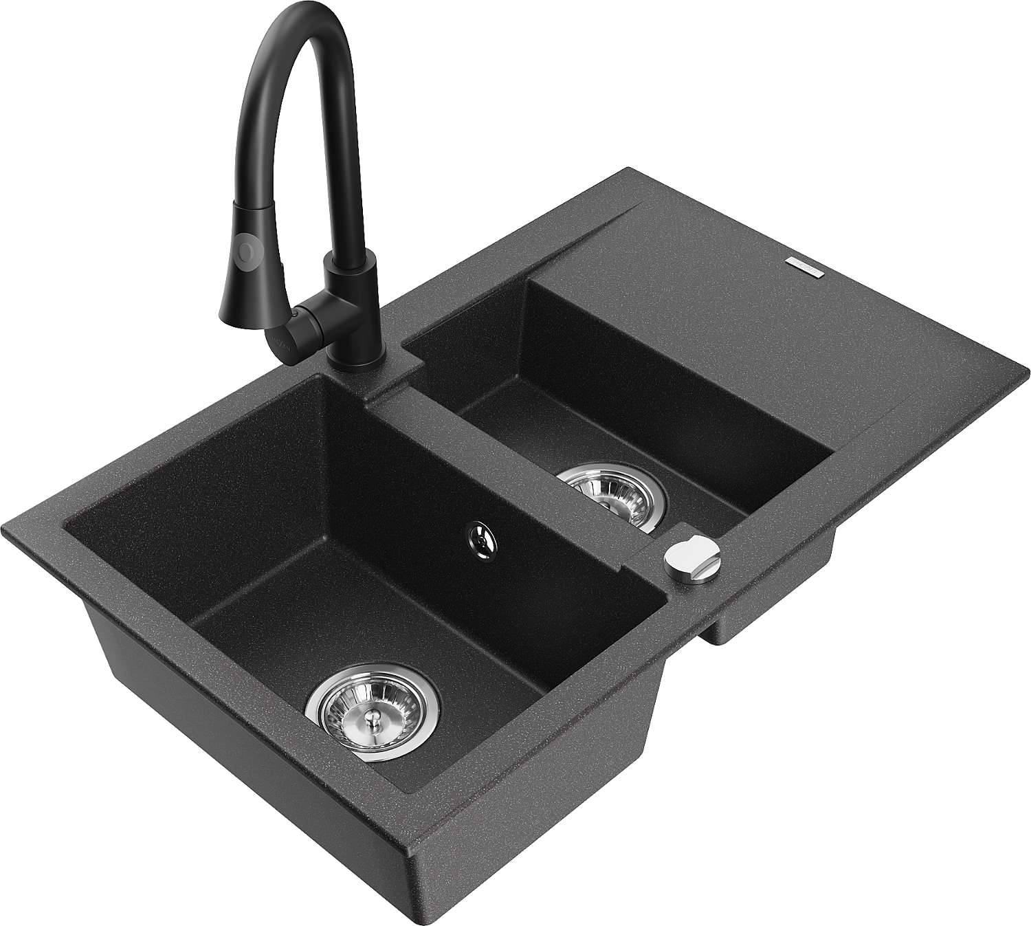 Mexen Gaspar dřez granitový 1,5-komorový s odkapávačem a kuchyňskou baterií Elia, černý s tečkami - 6507-76-670101-70