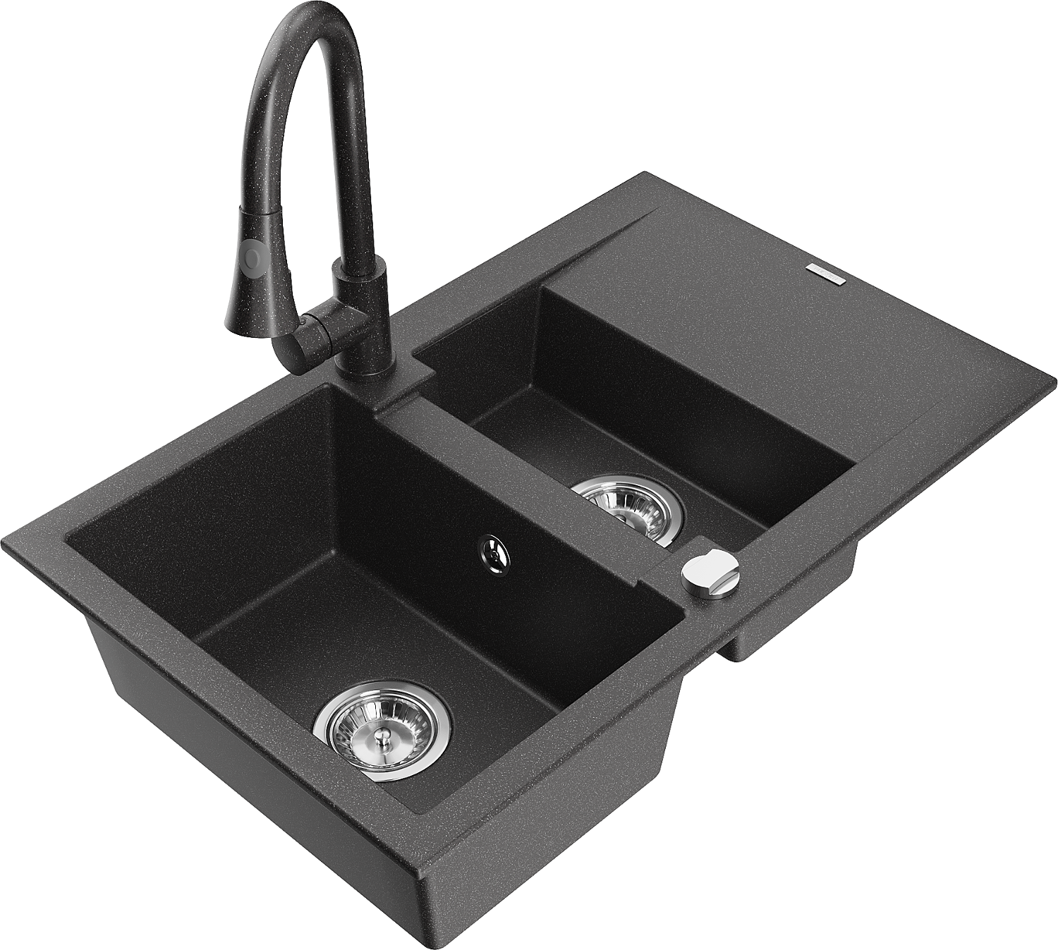 Mexen Gaspar granitový dřez 1,5-komorový s odkapávačem a kuchyňskou baterií Elia, černý skvrnitý - 6507-76-670101-76