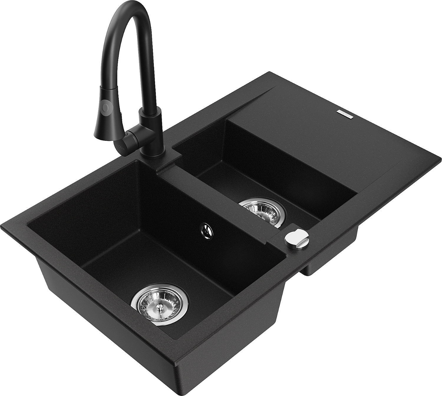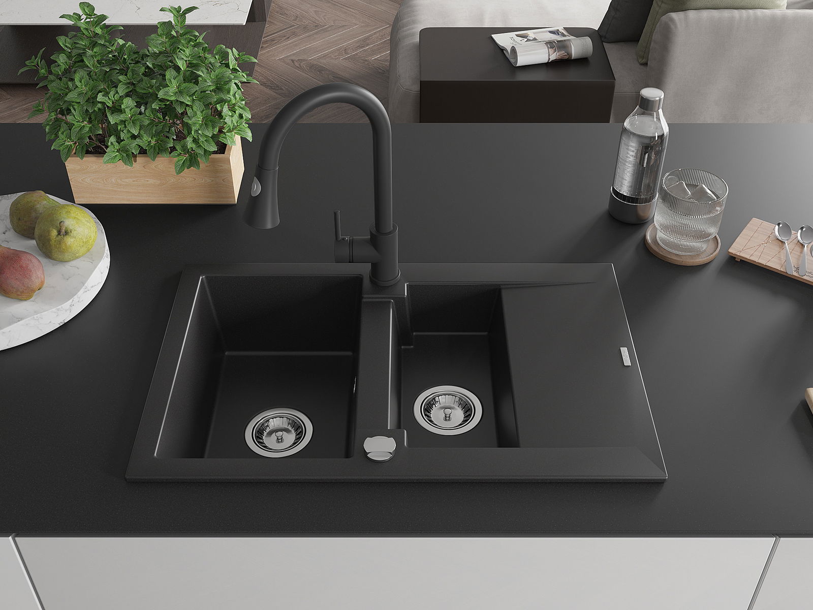 Mexen Gaspar granitový dřez 1,5-komorový s odkapávačem a kuchyňskou baterií Elia, černý - 6507-77-670101-70