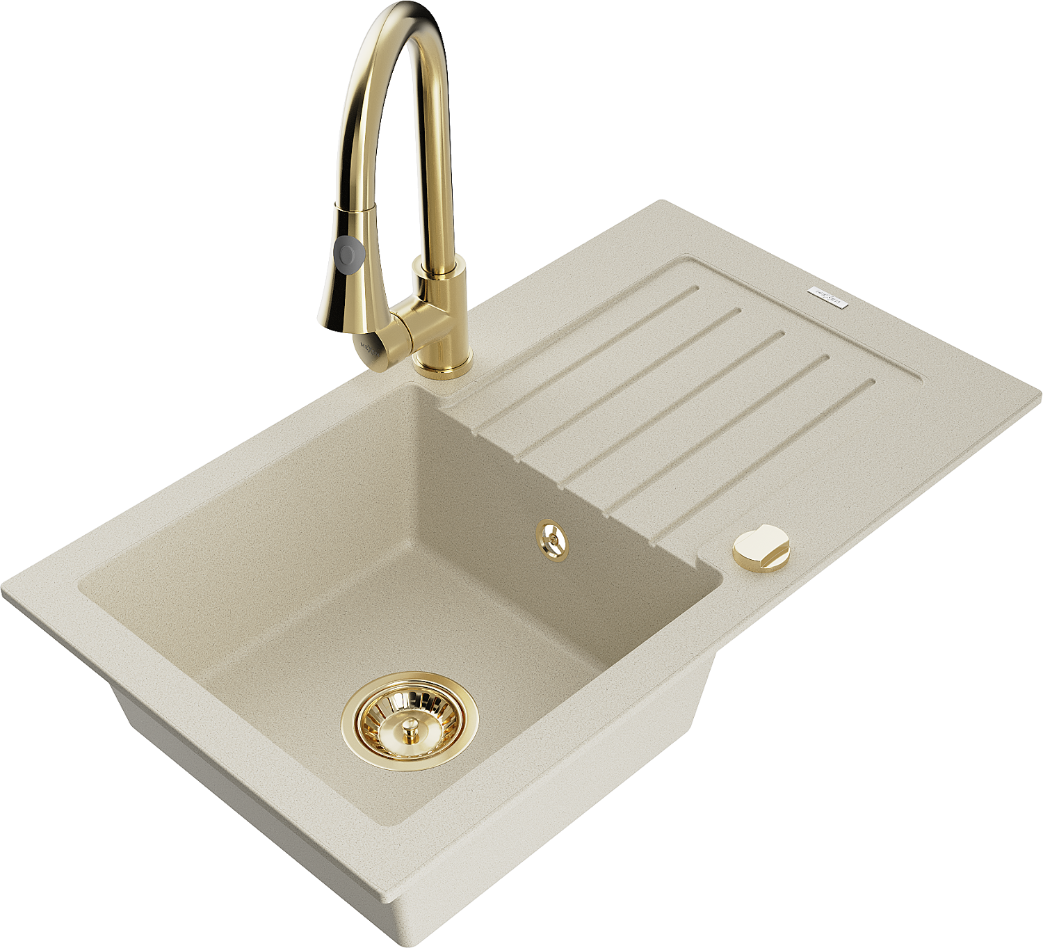 Mexen Pablo granitový dřez jednokomorový s odkapávačem a kuchyňskou baterií Elia, béžový - 6510-69-670101-50