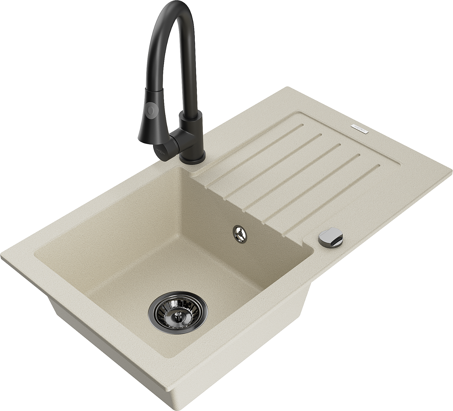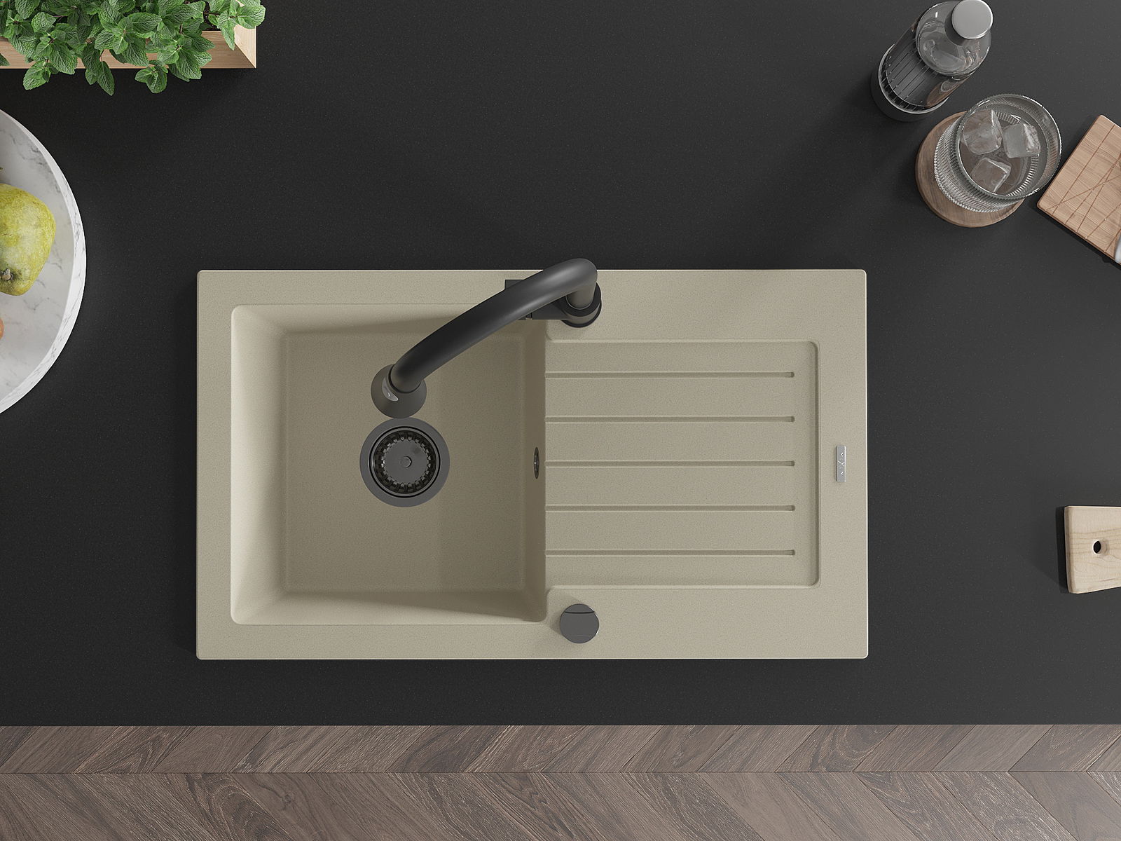 Mexen Pablo granitový dřez 1-komorový s odkapávačem a kuchyňskou baterií Elia, béžový - 6510-69-670101-70
