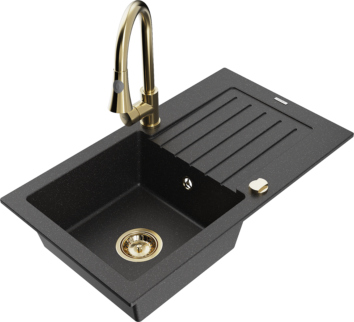 Mexen Pablo granitový dřez 1-komorový s odkapávačem a kuchyňskou baterií Elia, černý/stříbrný metalik - 6510-73-670101-50