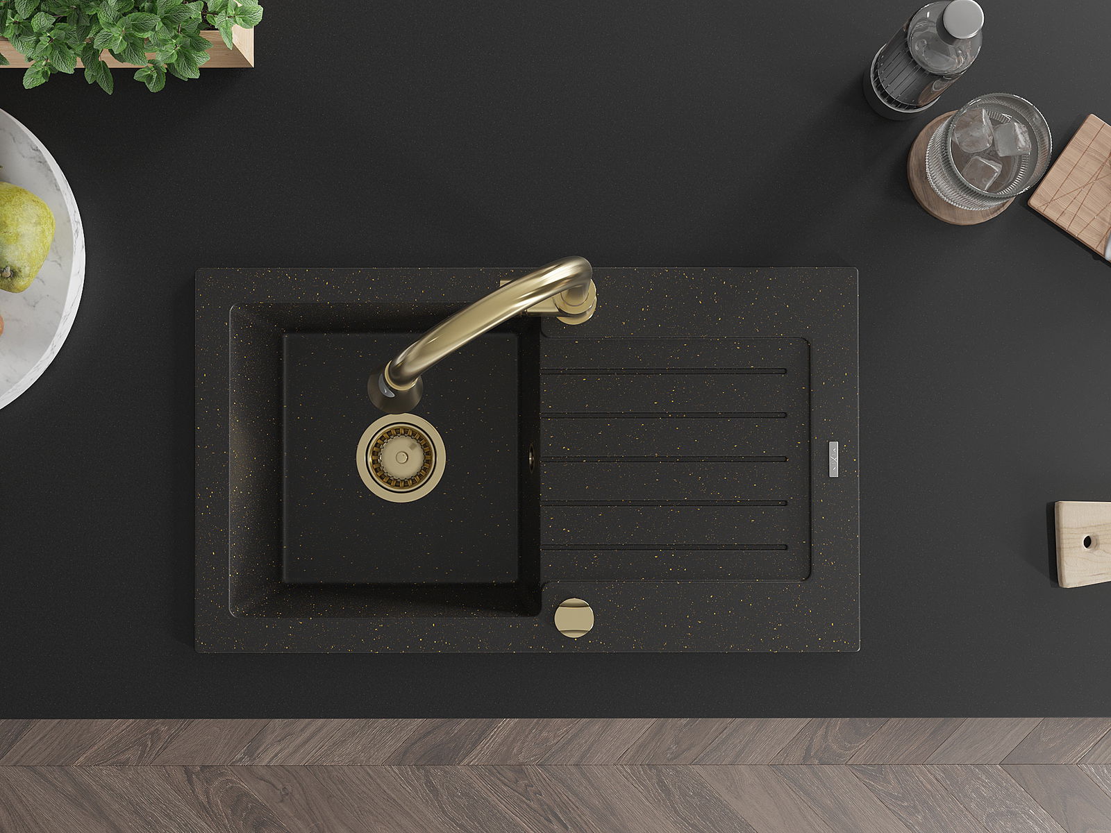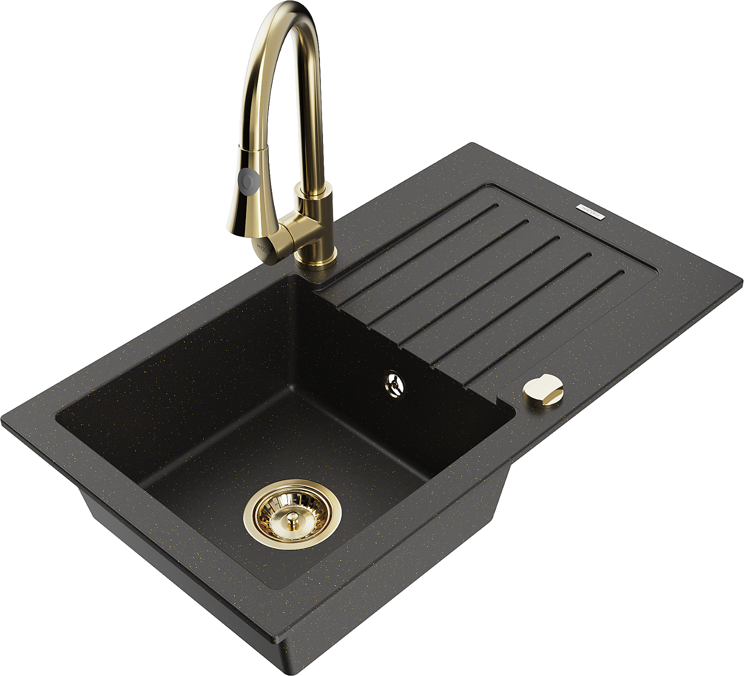 Mexen Pablo granitový dřez 1-komorový s odkapávačem a kuchyňskou baterií Elia, černý/zlatý metalik - 6510-75-670101-50