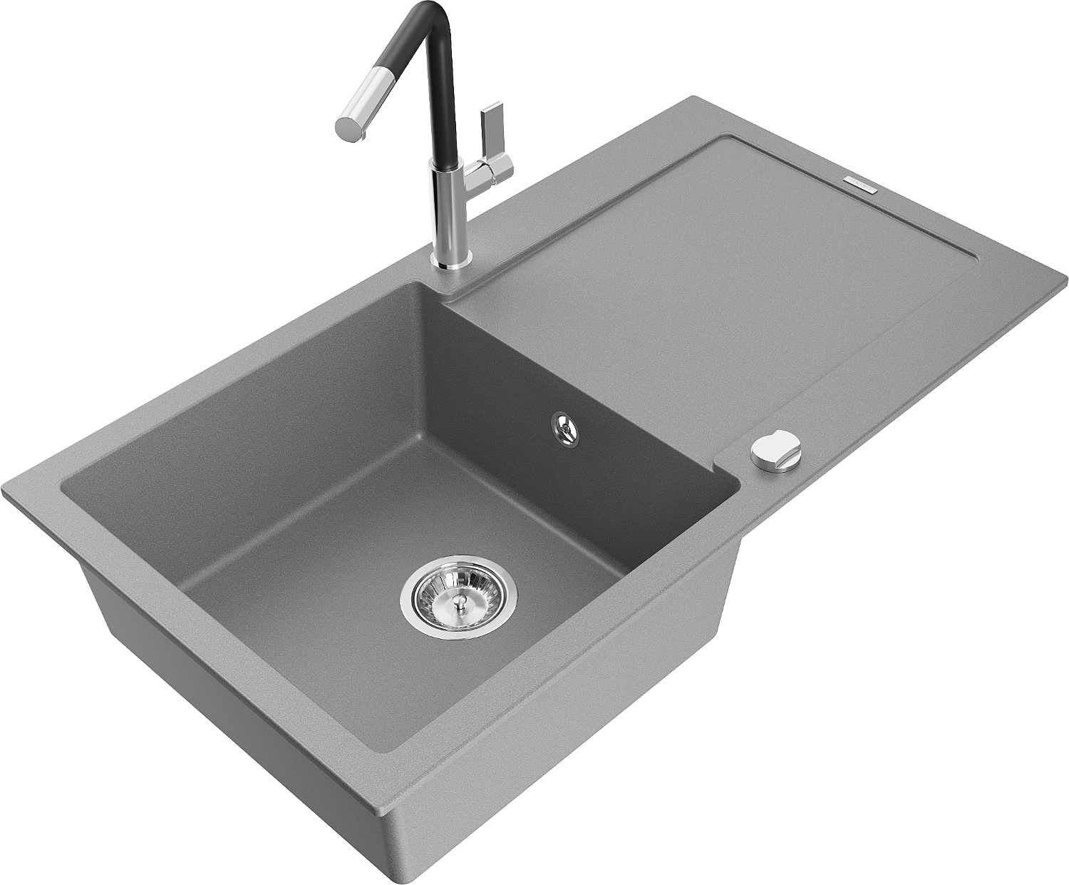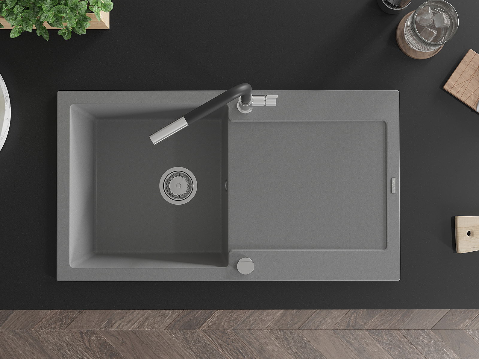 Mexen Leo granitový dřez 1-komorový s odkapávačem a kuchyňskou baterií Flora, šedý - 6501-71-670401-07