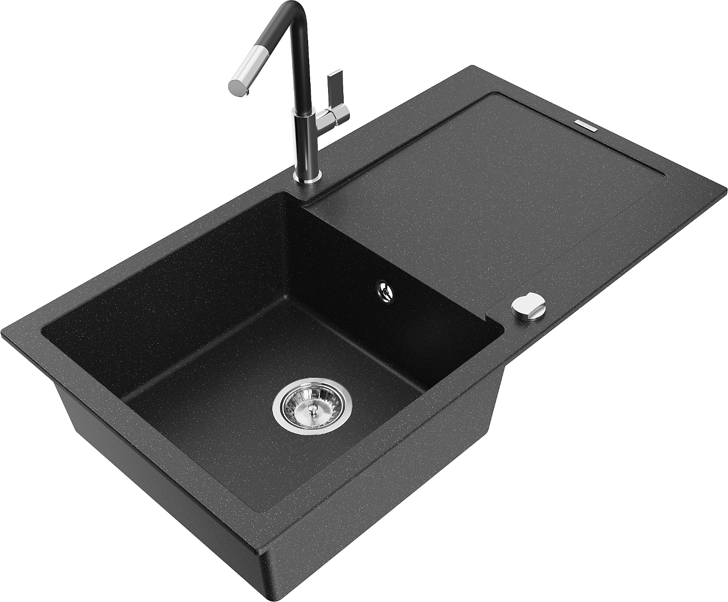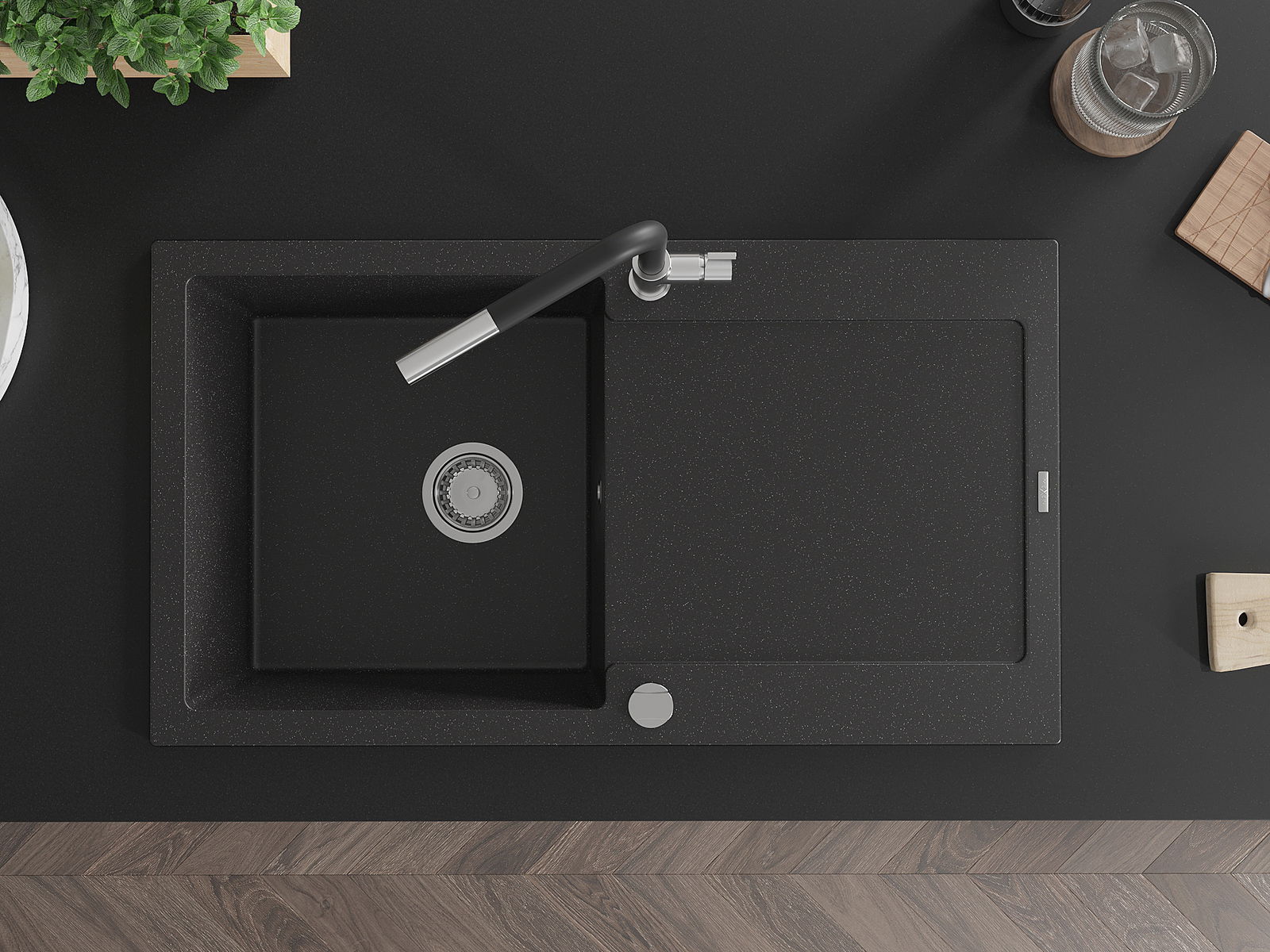 Mexen Leo granitový dřez 1-komorový s odkapávačem a kuchyňskou baterií Flora, černý/stříbrný metalík - 6501-73-670401-07