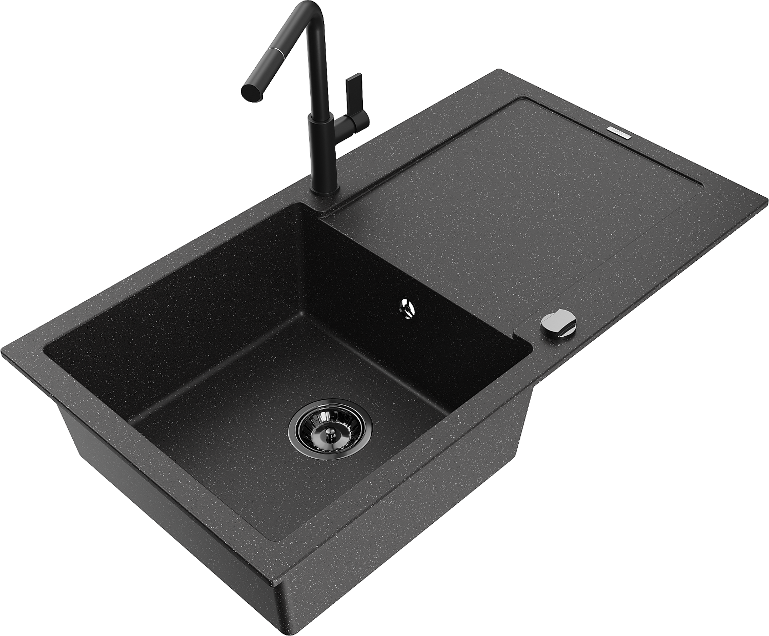 Mexen Leo granitový dřez 1-komorový s odkapávačem a kuchyňskou baterií Flora, černý/stříbrný metalik - 6501-73-670401-70-B