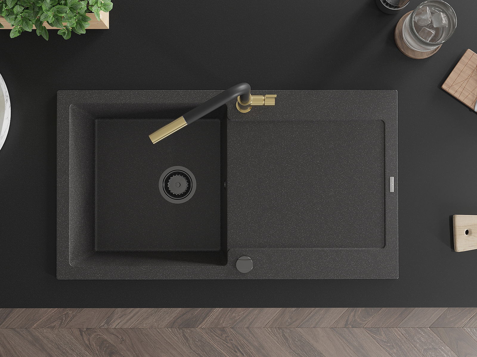 Mexen Leo granitový dřez 1-komorový s odkapávačem a kuchyňská baterie Flora, černý skvrnitý - 6501-76-670401-57-B