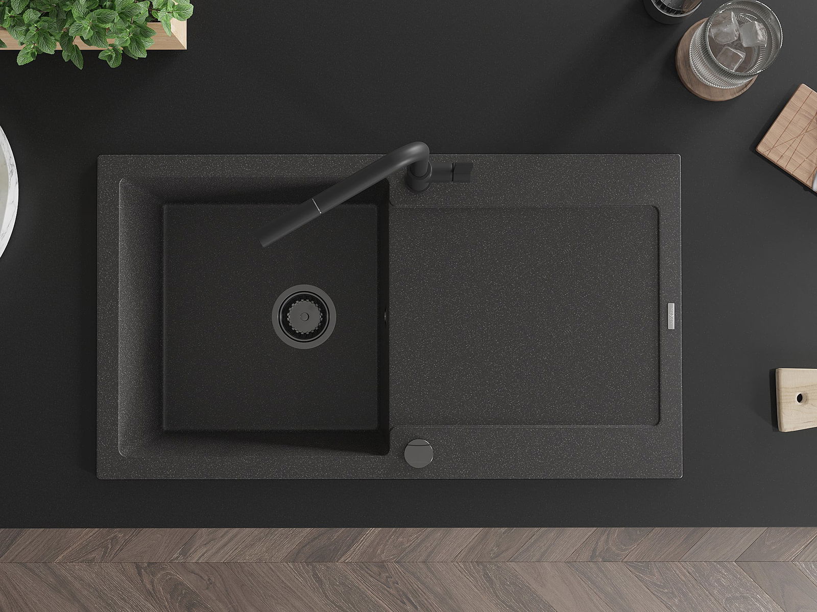 Mexen Leo granitový dřez 1-komorový s odkapávačem a kuchyňskou baterií Flora, černý s tečkami - 6501-76-670401-70-B