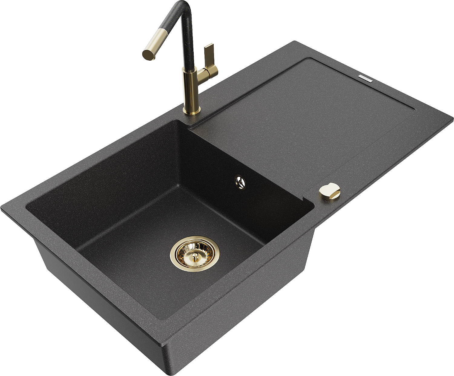 Mexen Leo granitový dřez 1-komorový s odkapávačem a kuchyňskou baterií Flora, černý skvrnitý - 6501-76-670401-75-G