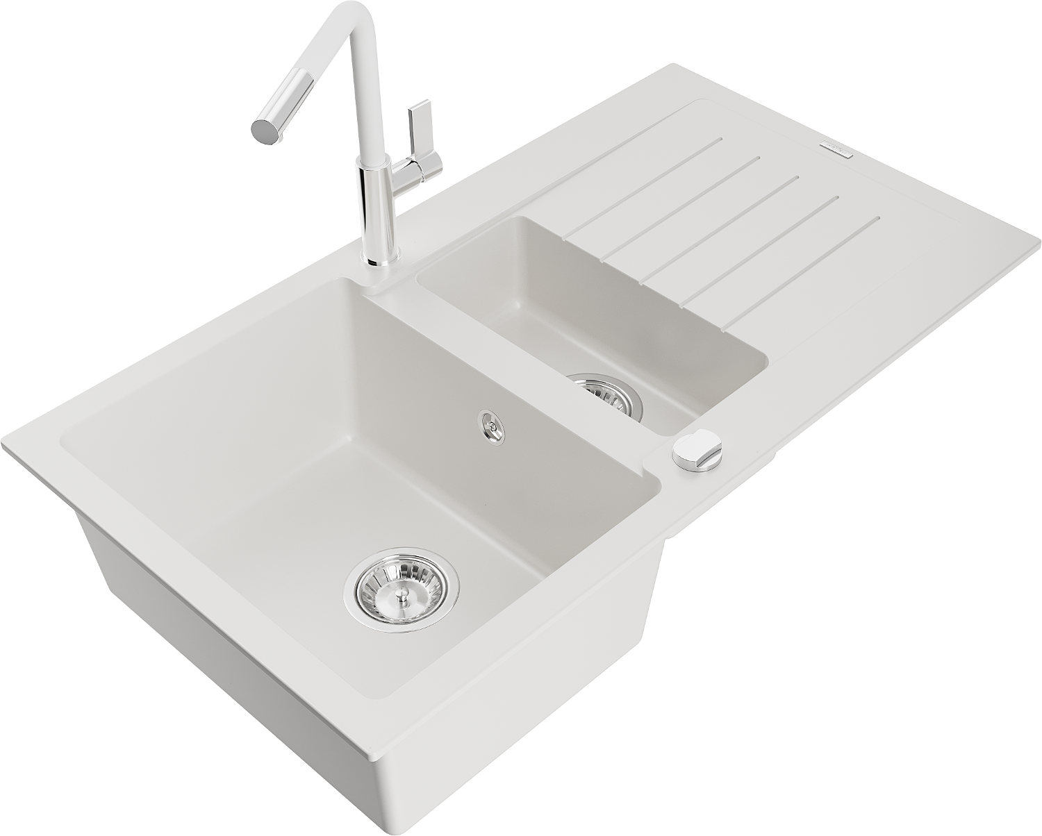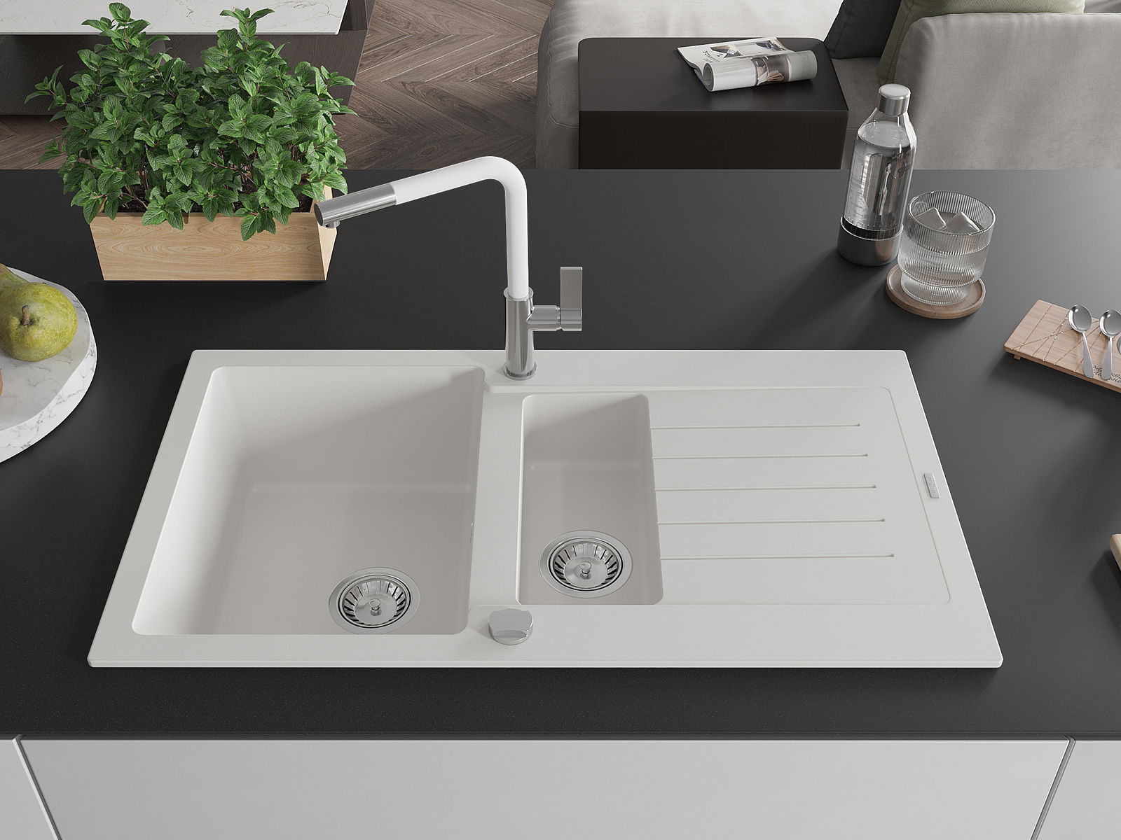 Mexen Matias Granitový Dřez 1,5-komorový s Odkapávačem a Kuchyňskou Baterií Flora, bílý - 6502-20-670401-02