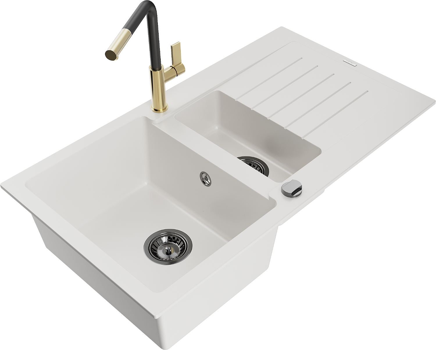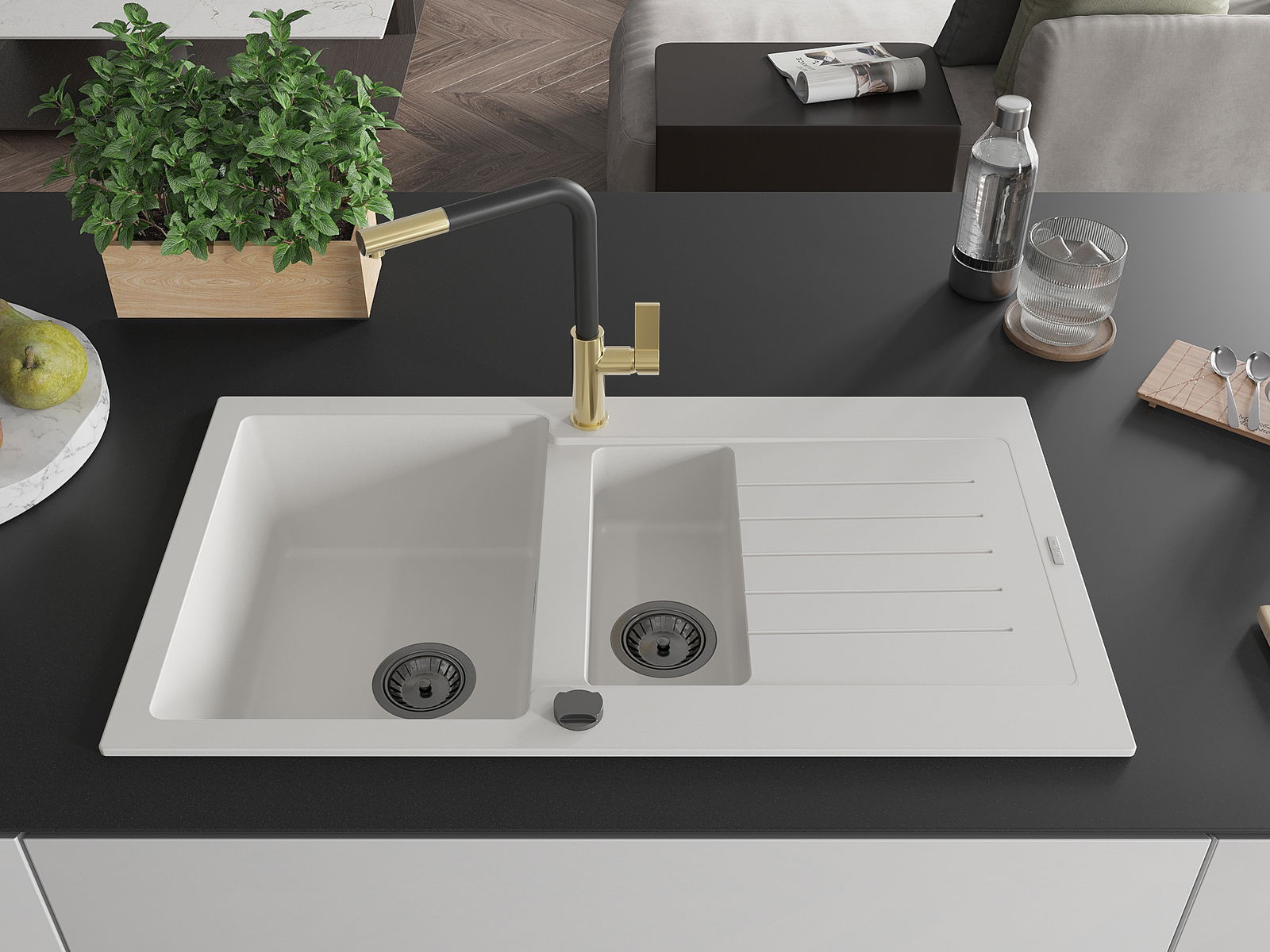 Mexen Matias granitový dřez 1,5-komorový s odkapávačem a kuchyňskou baterií Flora, bílý - 6502-20-670401-57-B